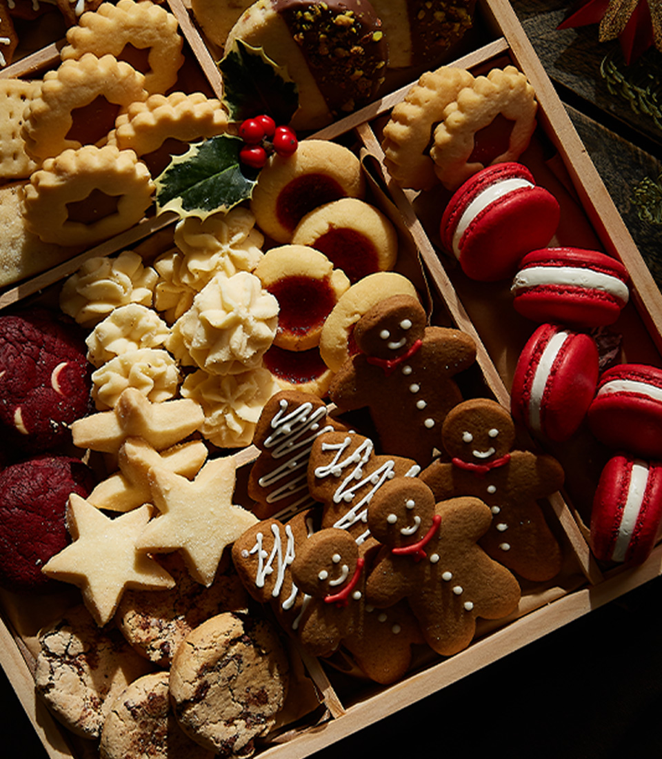Christmas Sweet Cookies Box Celebrate the season with this luxurious gift box filled with an assortment of handcrafted cookies and macarons. From delicate snowflake cookies and buttery shortbreads to festive gingerbread men and red macarons, each treat is baked to perfection. Presented in a charming wooden box, it's an irresistible holiday gift for loved ones or colleagues.What Inside :Charlotte Shortbread Cookies Pistachio / 5 Pcs.Charlotte Shortbread Cookies Chocolate / 4 Pcs.Charlotte Shortbread Cookies ( Star ) / 10 Pcs.Charlotte Shortbread Cookies ( Stick ) / 6 Pcs.Charlotte Jammy Shortbread Star Cookies / 4 Pcs.Charlotte Shortbread Star Cookies (Chocolate) / 4 Pcs.Charlotte Gingerbread / 2 Pcs.Charlotte Gingerbread ( Snow ) / 3 Pcs.Charlotte Gingerbread ( Tree ) / 3 Pcs.Charlotte Butter Cookie / 10 Pcs.Charlotte Classic Chocolate Chip Cookies / 4 Pcs.Charlotte Thrumpin / 5 Pcs.Charlotte Macarons / 5 Pcs.Ribbon & DecorationWooden BoxMain Ingredients :Butter Cookie : Unsalted Butter, Icing Sugar, Cake Flour, All-Purpose Flour, Milk Powder, Baking Powder, Evaporated Milk, Vanilla Extract, Butter Flavor.Gingerbread : Unsalted butter, Brown sugar, Egg, Golden syrup, All-purpose flour, Baking soda, Ground ginger, Allspice.Shortbread Cookies : Butter, All-Purpose Flour, Salt, Sugar.Shortbread Star Cookies (Chocolate) : All-Purpose Flour, Granulated Sugar, Unsalted Butter, Salt, Water, Butter Flavor, Dark Chocolate, White Chocolate.Jammy Shortbread Star Cookies : All-Purpose Flour, Granulated Sugar, Unsalted Butter, Salt, Water, Butter Flavor, Strawberry Jam.Thrumpin : All-Purpose Flour, Salt, Unsalted Butter, Icing Sugar, Vanilla Extract, Egg Yolk, Raspberry Jam.Classic Chocolate Chip Cookies : Unsalted Butter, Brown Sugar, Granulated Sugar, Egg, Vanilla Extract, All-Purpose Flour, Cake Flour, Salt, Baking Powder, Baking Soda, Dark Chocolate.Gifts For The OccasionChristmas Gift, Holiday Gifts, Christmas Bakery Gift, Christmas Gifts For Friends, Congratulation Gift, New Year Gift, Thank You Gift, Lucky Gift, Christmas Season Festival. *** Due to inconsistent market conditions, we might replace any flowers with another of equivalent value in view of stock availability without prior notice.
