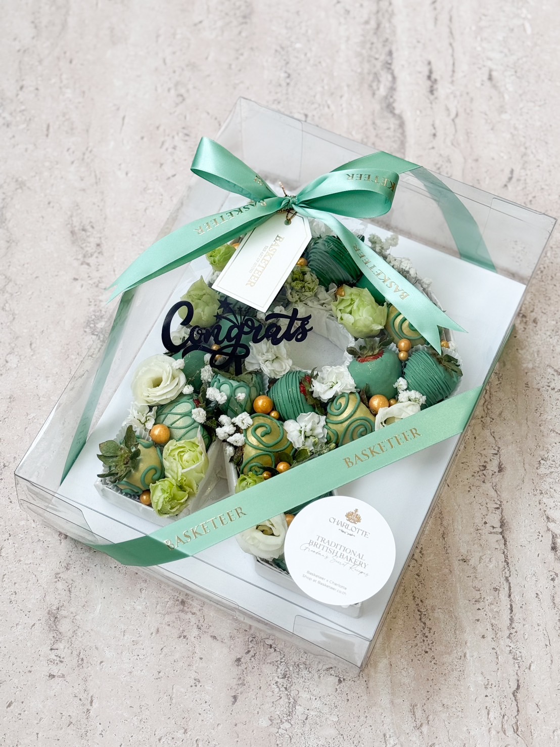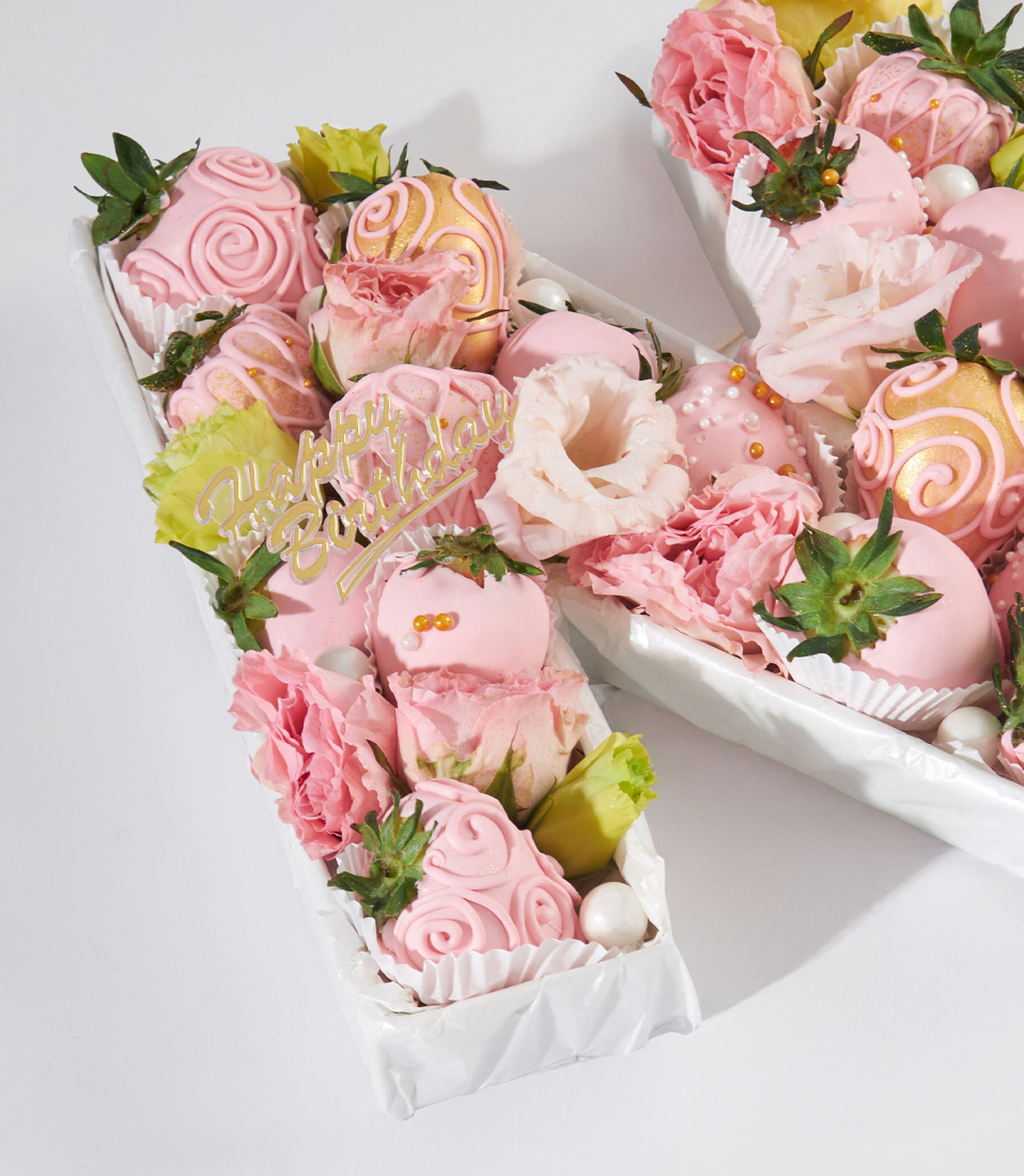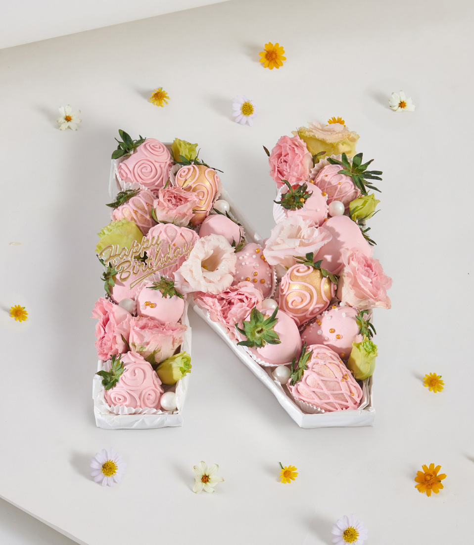 A sweet birthday gift box in letter N, filled with chocolate-dipped strawberries and pastel flowers for an unforgettable surprise.
