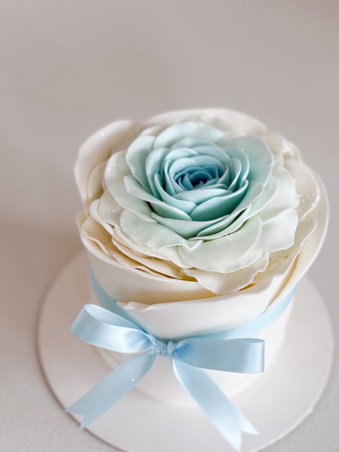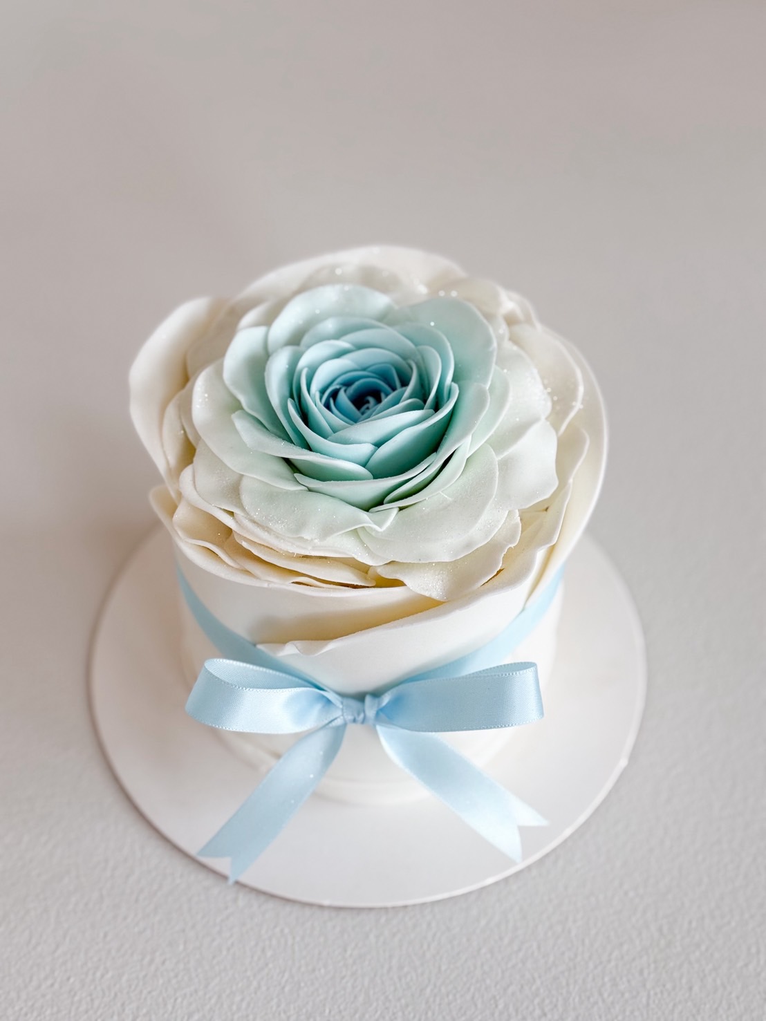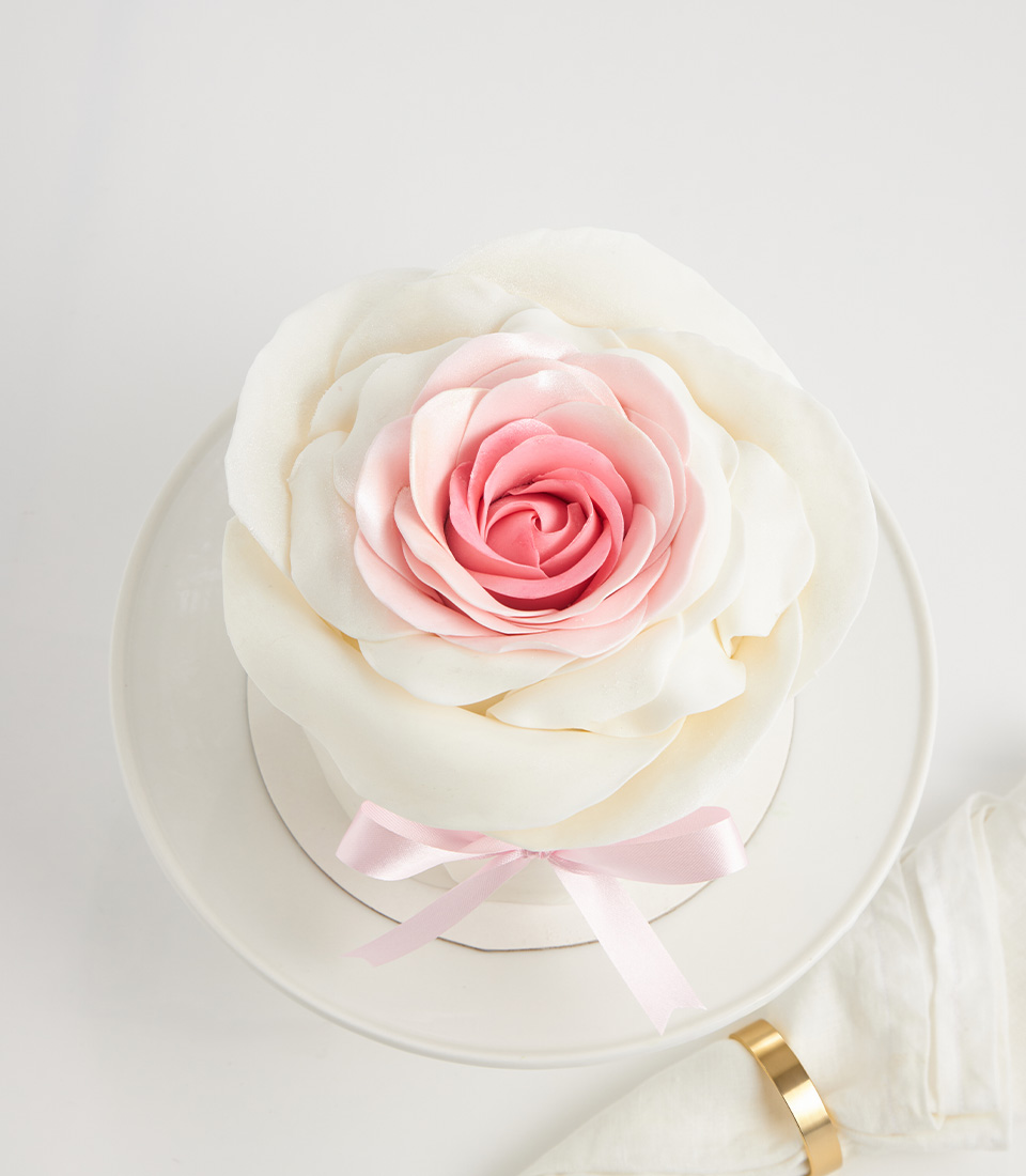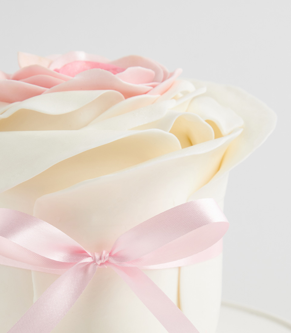 Elegant royal vanilla cake topped with handcrafted pink roses and a soft satin ribbon—a timeless and delicate treat to savor.