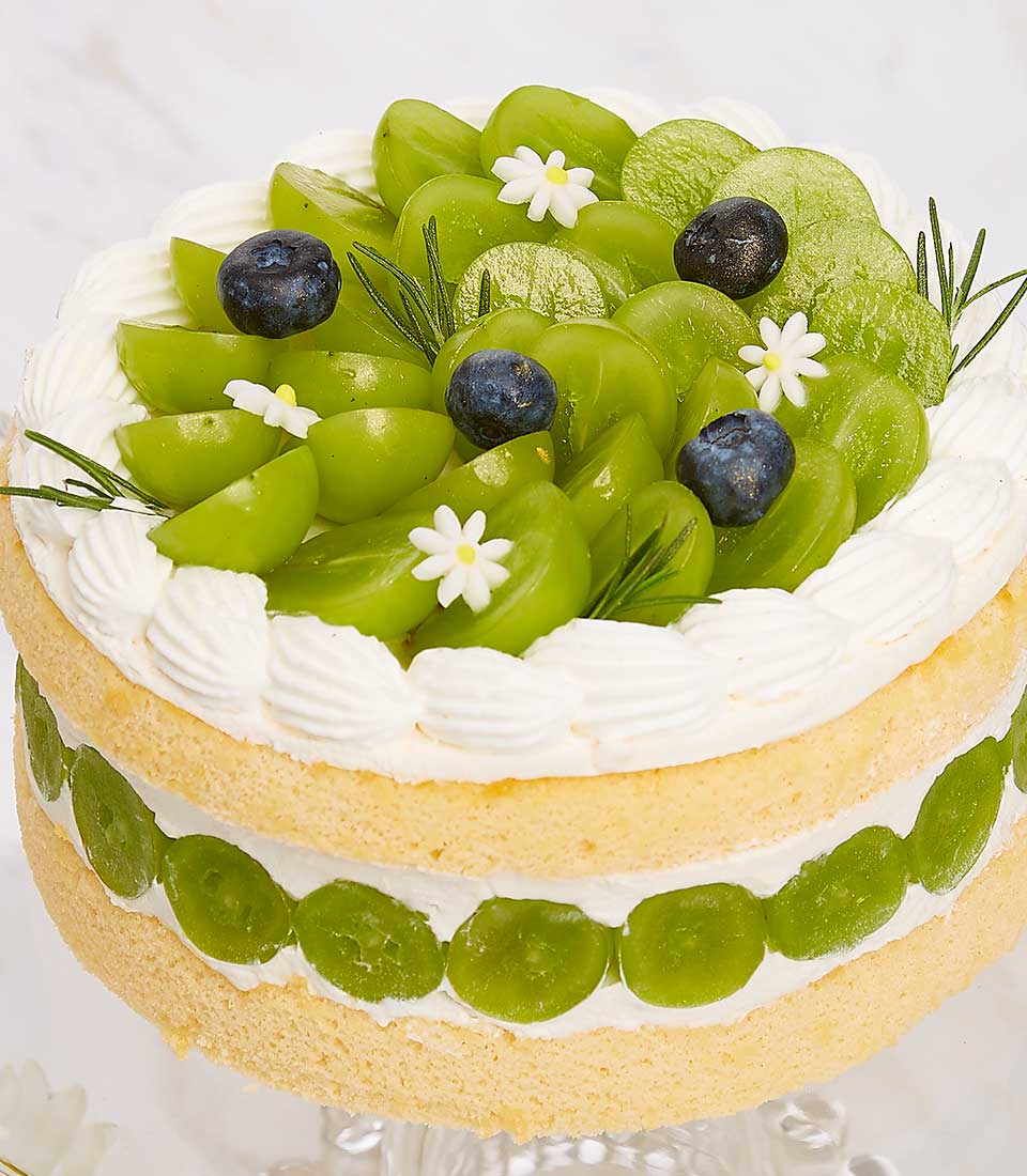 Grape & Blueberry Birthday Cake This green grape chiffon cake features airy vanilla sponge, fresh green grapes, and light whipped cream. Topped with whole grapes, rosemary, and a birthday topper, it’s a fresh fruit cake perfect for birthdays, gifts, or elegant occasions. Refreshing, soft, and beautifully presented.