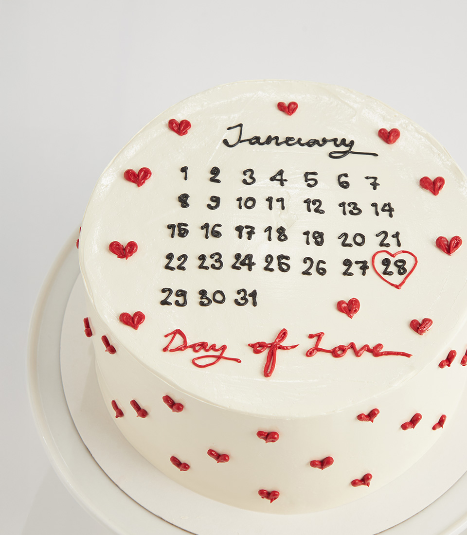 Celebrate your special day with a custom calendar cake—vanilla sponge, heart sugar décor, and your date beautifully piped on top.