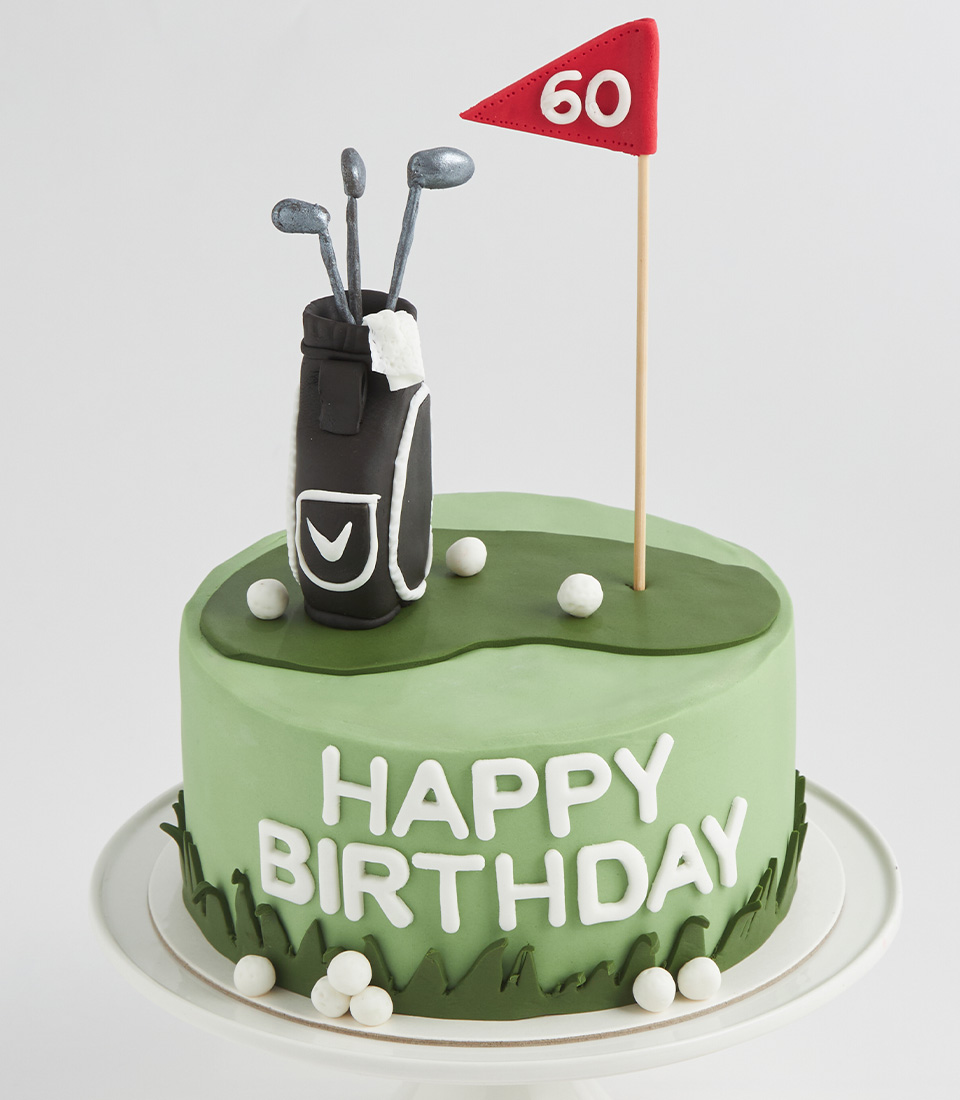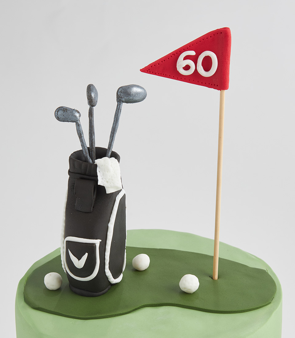 Celebrate their special day with a golf-themed cake, complete with fondant golf bag, balls, and a custom flag featuring their age.