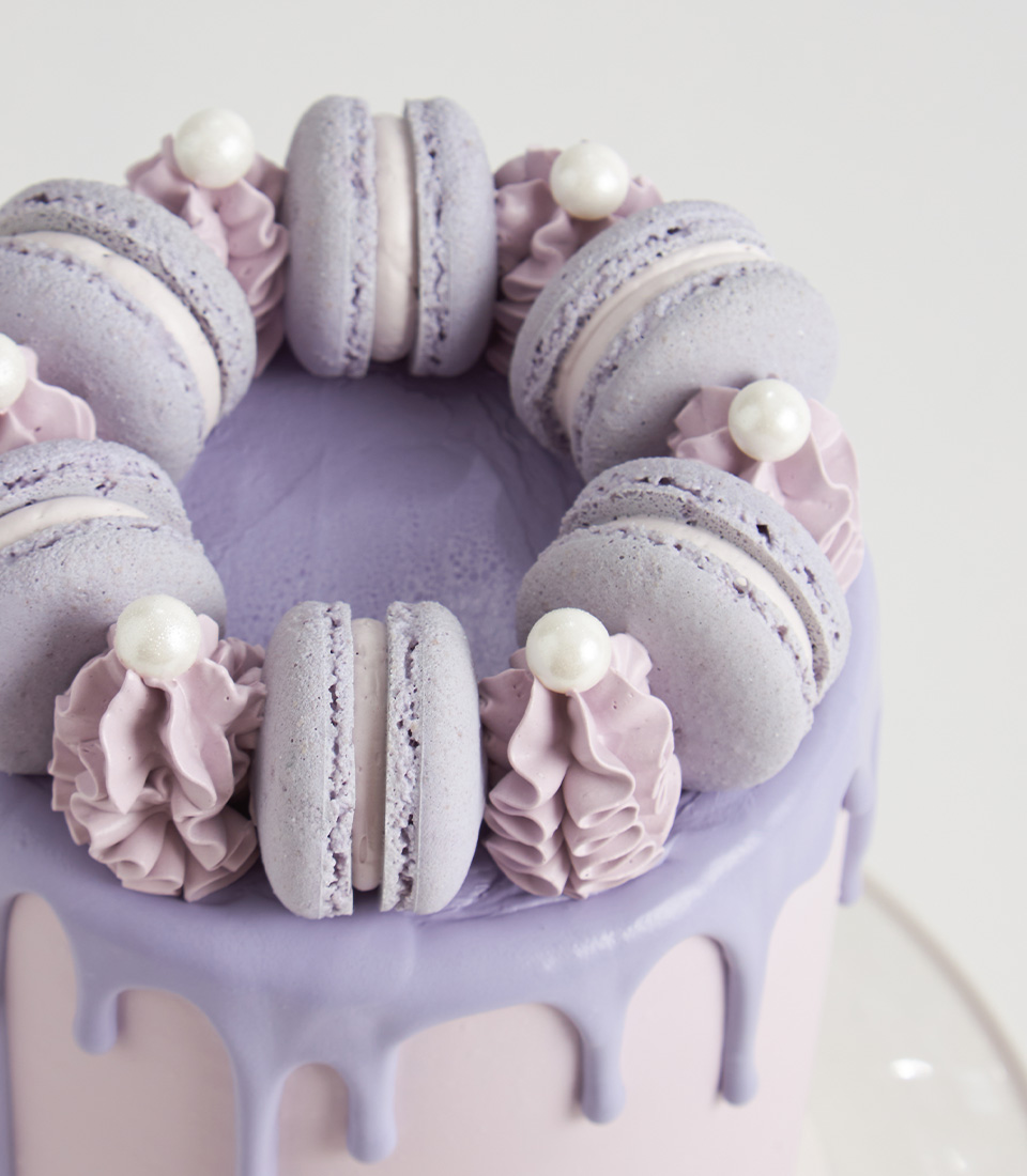 A regal cake topped with purple drip, delicate macarons, and luscious buttercream—perfect for chic birthday gifts or elegant celebrations.