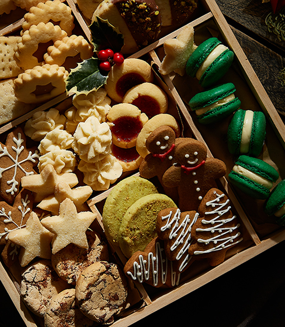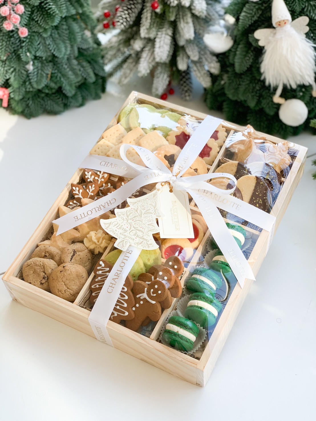 Grand Christmas Cookies Tray Celebrate the season with our Grand Christmas Cookie Tray - Deluxe Edition, featuring a variety of handcrafted cookies like gingerbread men, buttery stars, pistachio delights, and colorful macarons. Made with premium ingredients, each cookie offers a perfect balance of flavor and festive charm. The ideal luxurious gift or holiday centerpiece that’s sure to spread cheer and impress.What Inside :Charlotte Shortbread Cookies Pistachio / 5 Pcs.Charlotte Shortbread Cookies Chocolate / 4 Pcs.Charlotte Shortbread Cookies ( Star ) / 10 Pcs.Charlotte Shortbread Cookies ( Stick ) / 6 Pcs.Charlotte Jammy Shortbread Star Cookies / 4 Pcs.Charlotte Shortbread Star Cookies (Chocolate) / 4 Pcs.Charlotte Gingerbread / 2 Pcs.Charlotte Gingerbread ( Snow ) / 3 Pcs.Charlotte Gingerbread ( Tree ) / 3 Pcs.Charlotte Butter Cookie / 10 Pcs.Charlotte Classic Chocolate Chip Cookies / 4 Pcs.Charlotte Thrumpin / 5 Pcs.Charlotte Macarons / 5 Pcs.Ribbon & DecorationWooden BoxMain Ingredients :Butter Cookie : Unsalted Butter, Icing Sugar, Cake Flour, All-Purpose Flour, Milk Powder, Baking Powder, Evaporated Milk, Vanilla Extract, Butter Flavor.Gingerbread : Unsalted butter, Brown sugar, Egg, Golden syrup, All-purpose flour, Baking soda, Ground ginger, Allspice.Shortbread Cookies : Butter, All-Purpose Flour, Salt, Sugar.Shortbread Star Cookies (Chocolate) : All-Purpose Flour, Granulated Sugar, Unsalted Butter, Salt, Water, Butter Flavor, Dark Chocolate, White Chocolate.Jammy Shortbread Star Cookies : All-Purpose Flour, Granulated Sugar, Unsalted Butter, Salt, Water, Butter Flavor, Strawberry Jam.Thrumpin : All-Purpose Flour, Salt, Unsalted Butter, Icing Sugar, Vanilla Extract, Egg Yolk, Raspberry Jam.Classic Chocolate Chip Cookies : Unsalted Butter, Brown Sugar, Granulated Sugar, Egg, Vanilla Extract, All-Purpose Flour, Cake Flour, Salt, Baking Powder, Baking Soda, Dark Chocolate.Gifts For The OccasionChristmas Gift, Holiday Gifts, Christmas Bakery Gift, Christmas Gifts For Friends, Congratulation Gift, New Year Gift, Thank You Gift, Lucky Gift, Christmas Season Festival. *** Due to inconsistent market conditions, we might replace any flowers with another of equivalent value in view of stock availability without prior notice.