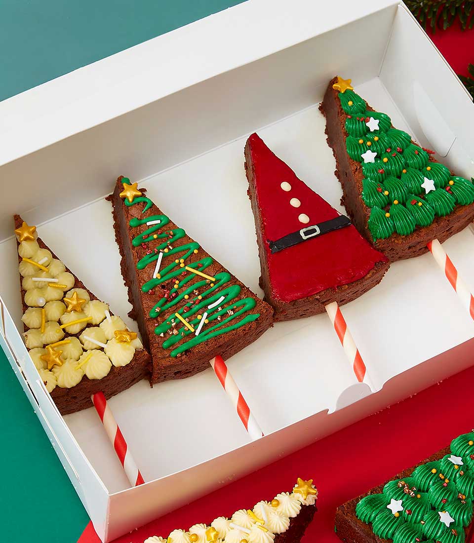Festive Christmas Tree Brownie Pops Gift Celebrate the holidays with our Festive Christmas Tree Brownie Pops! These rich and fudgy brownie slices are artfully decorated in delightful Christmas designs, including Christmas trees and Santa's suit, complete with vibrant frosting and sprinkles. Each brownie is served on a stick, making it a fun and festive treat for all ages.What Inside :Santa's Brownie Bites Set 4 Pcs. / 1 BoxGifts For The OccasionChristmas Gift, Holiday Gifts, Christmas Bakery Gift, Christmas Gifts For Friends, Congratulation Gift, New Year Gift, Thank You Gift, Lucky Gift, Christmas Season Festival. *** Due to inconsistent market conditions, we might replace any flowers with another of equivalent value in view of stock availability without prior notice.