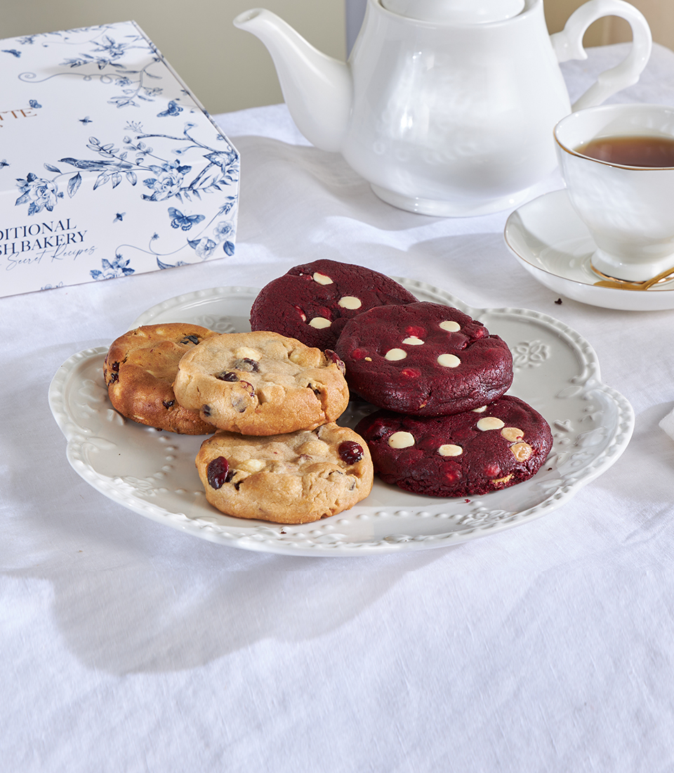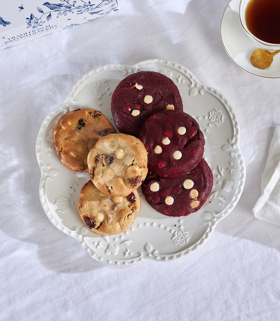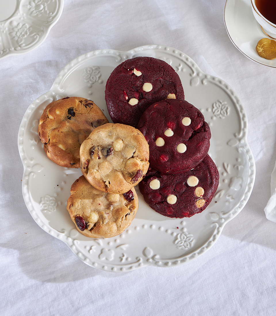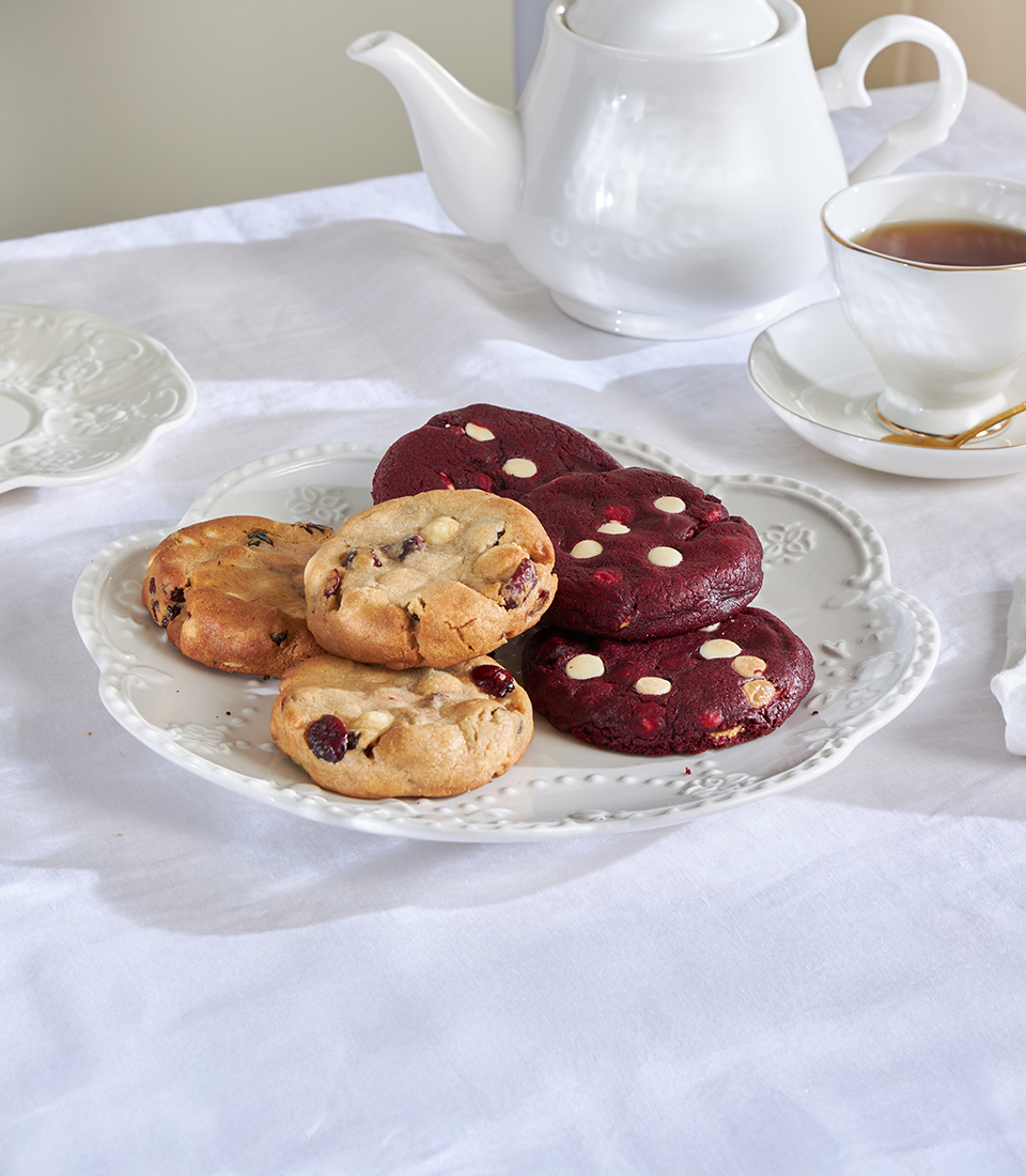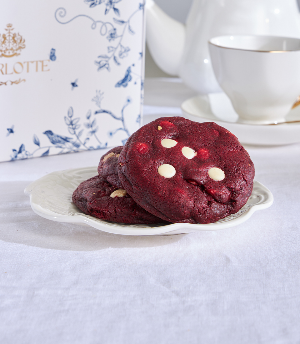 Soft, chewy cookies with white chocolate and macadamia. A modern twist on the classic cookie. Soft red velvet cookies with a hint of cocoa, baked with white chocolate chips. A rich and colorful twist on a classic favorite.