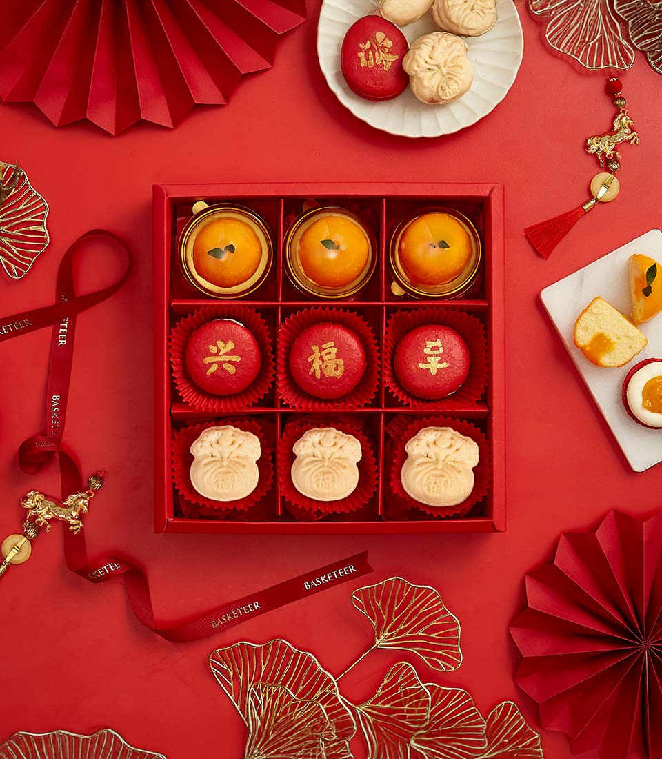 A premium Chinese New Year bakery gift set by Charlotte Bakery, featuring a festive assortment of mandarin mousse cakes, lucky macarons, and prosperity pastries. Elegantly presented to share wishes of prosperity, good fortune, and joyful celebrations for the Lunar New Year.