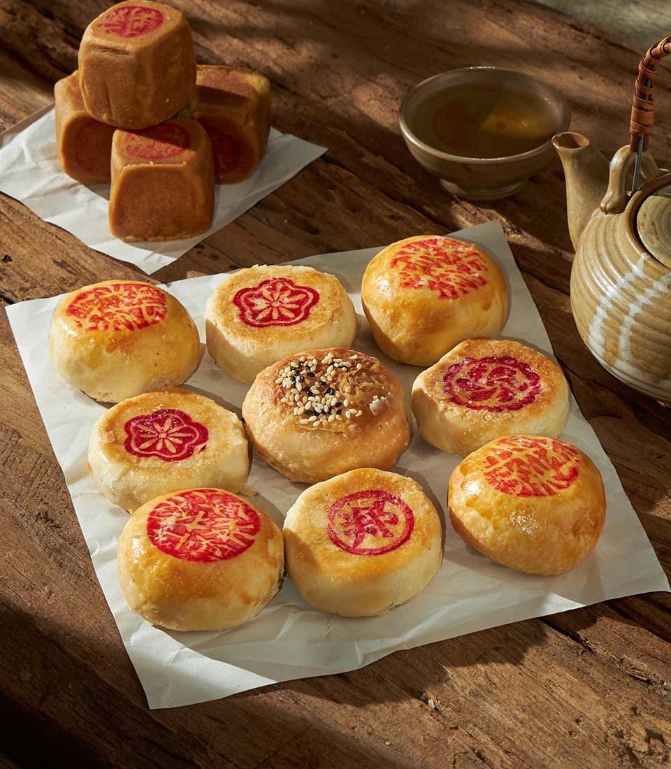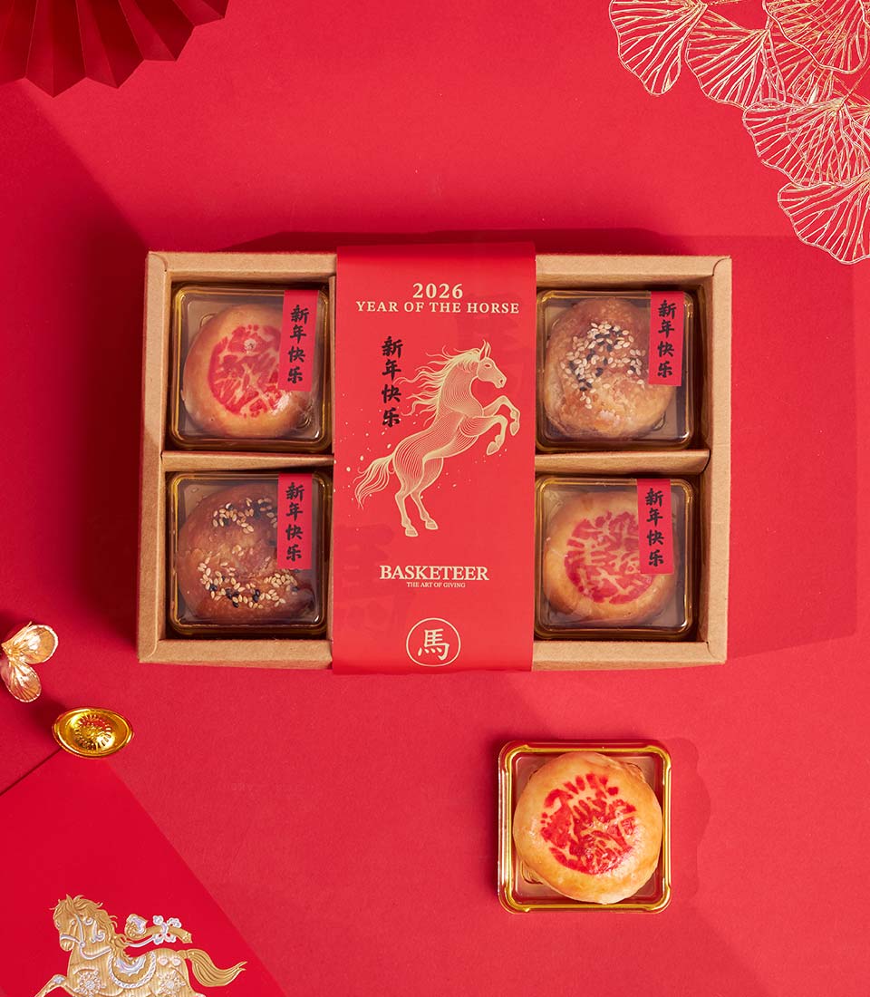 A traditional Chinese New Year pastry gift featuring classic Chinese pastries from traditional Chinese confectioners, filled with red bean, winter melon, Chinese date, and black sesame. Available in 6 or 9 pieces per box, perfect for sharing prosperity and tradition during the Lunar New Year.