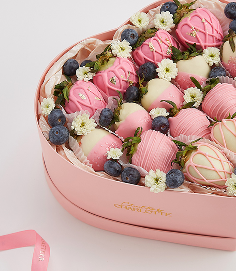Luxurious heart-shaped gift box with chocolate-dipped strawberries, fresh blueberries, and flowers—perfect for Valentine's Day.