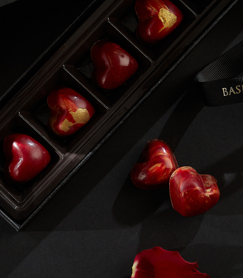 Indulge in luxurious heart-shaped chocolates with a dark red glossy finish and gold leaf accents, elegantly presented in a premium black gift box.