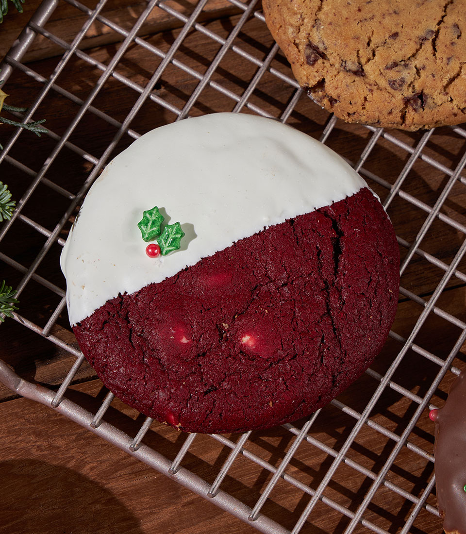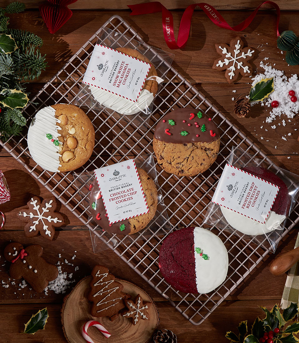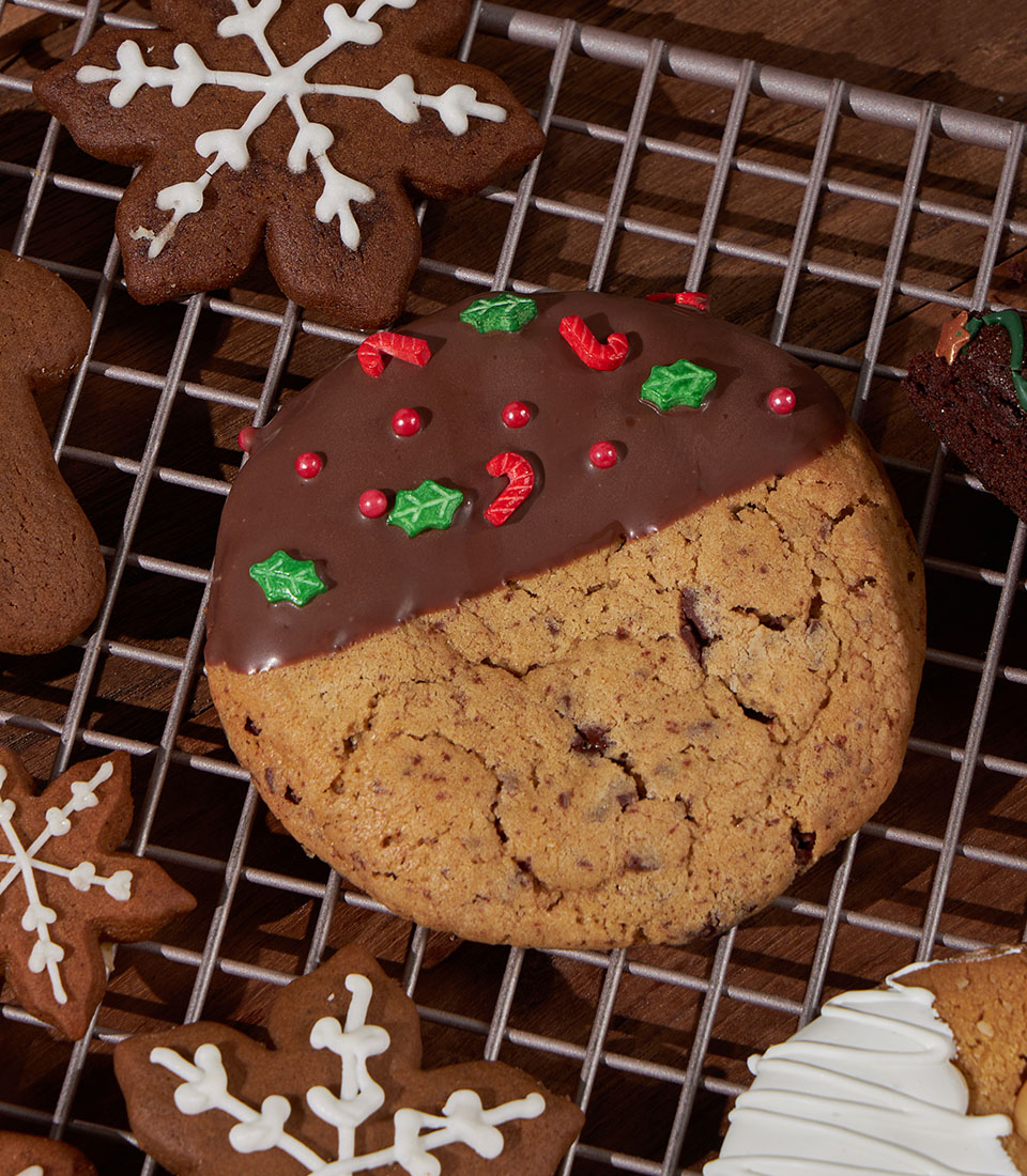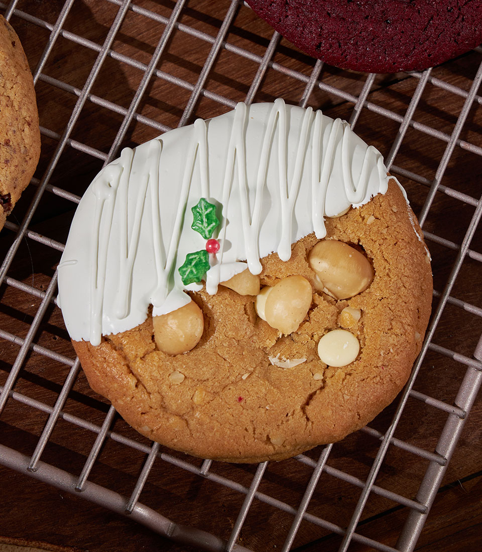 A festive collection of soft-baked Christmas cookies crafted with rich butter and indulgent toppings. Choose from chocolate frosted chip, snow white macadamia, red velvet, and other seasonal flavours, each finished with elegant chocolate details for a joyful holiday treat.