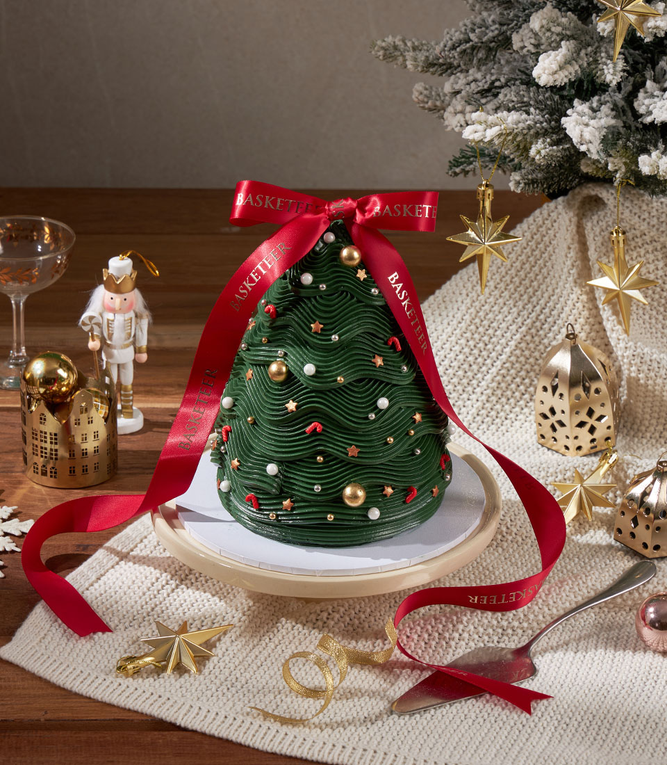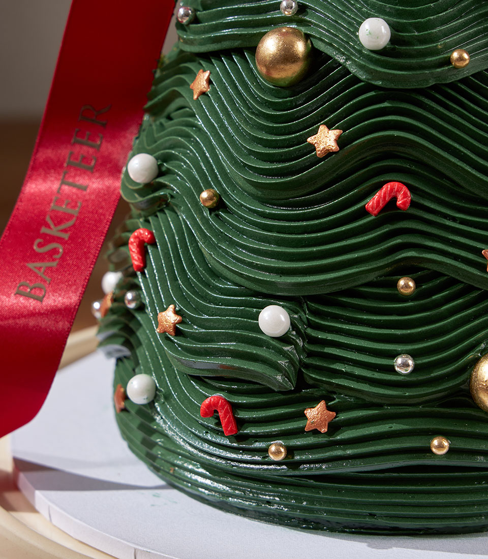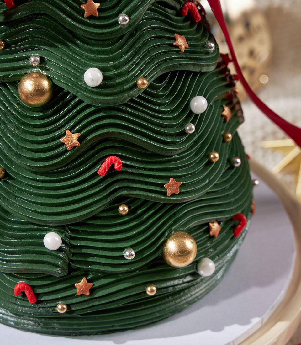 A rich chocolate sponge cake layered with smooth chocolate buttercream and finished with festive white and green buttercream, crafted in a beautiful Christmas tree shape.