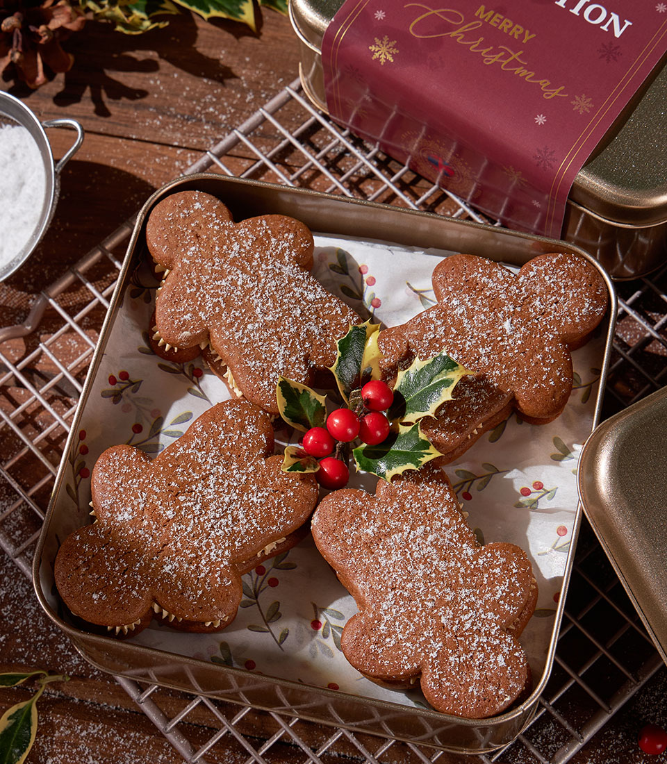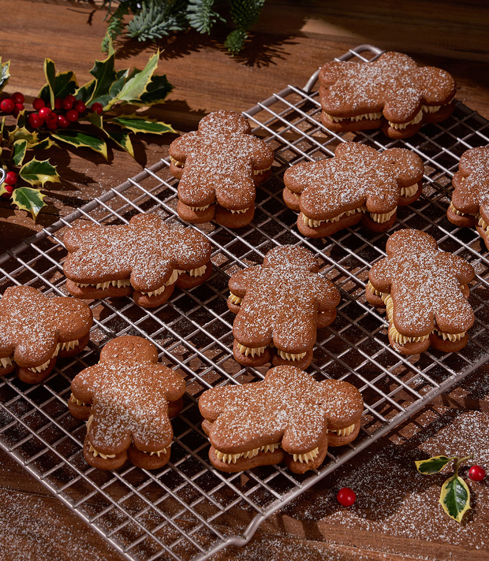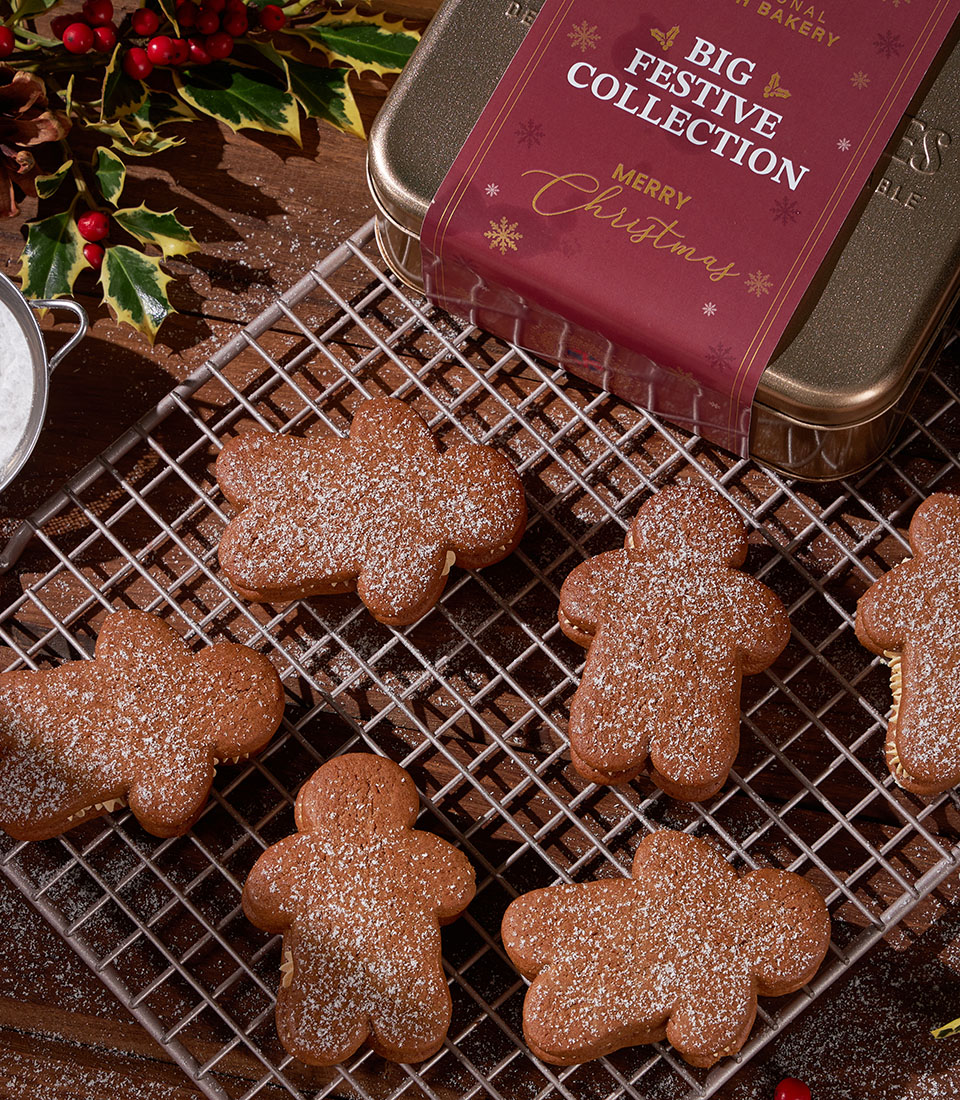 A festive box set of soft, spiced gingerbread cookies generously filled with smooth white buttercream - perfect for sharing and Christmas gifting.