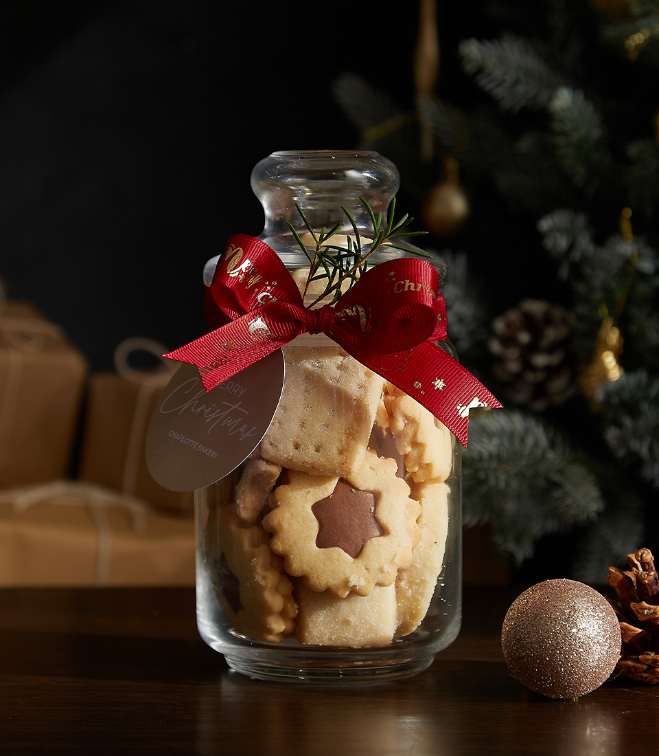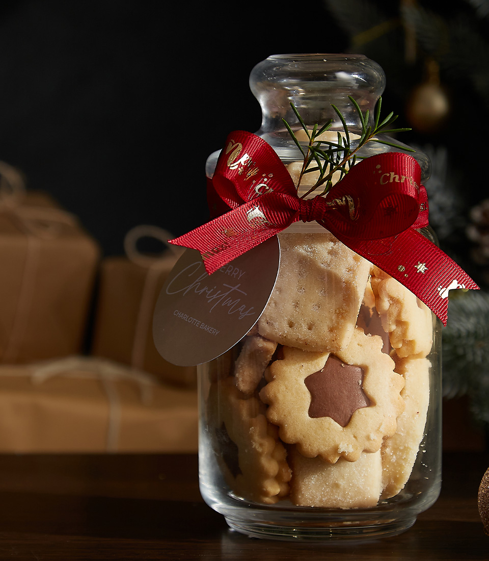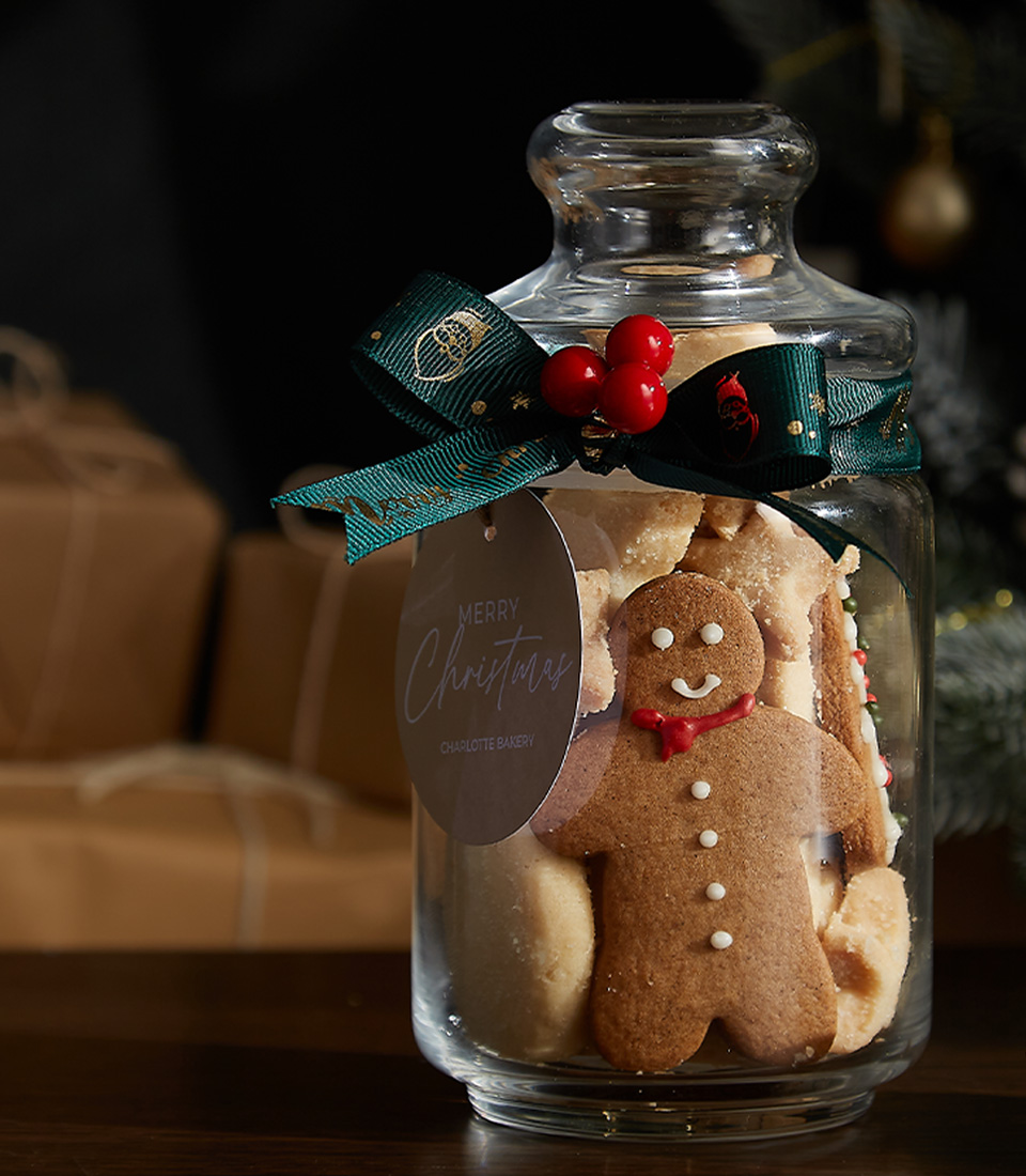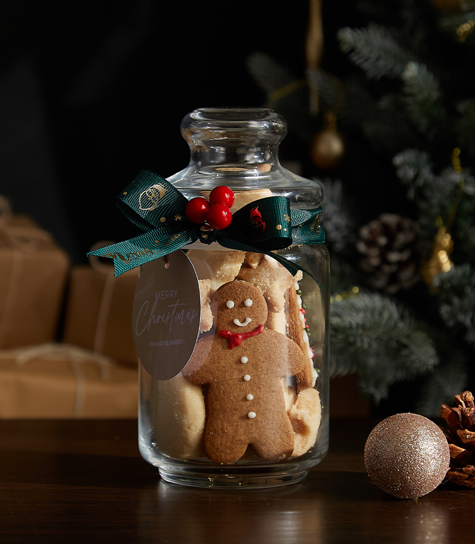 Festive Cookie Jar Duo featuring gingerbread cookies and shortbread treats in beautifully adorned glass jars, perfect for holiday gifting.