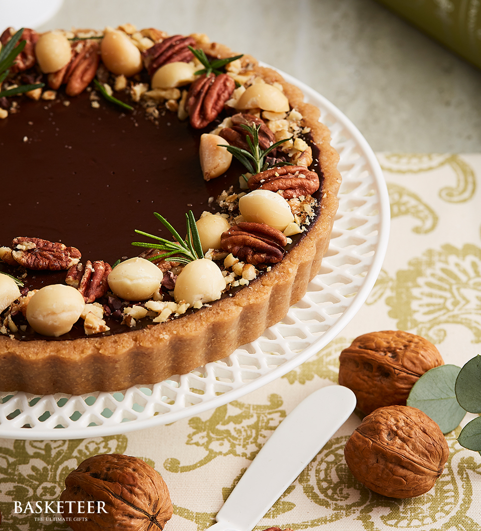 • On top garnished with macadamia nuts, pecans, chopped walnuts, and sprigs of rosemary
