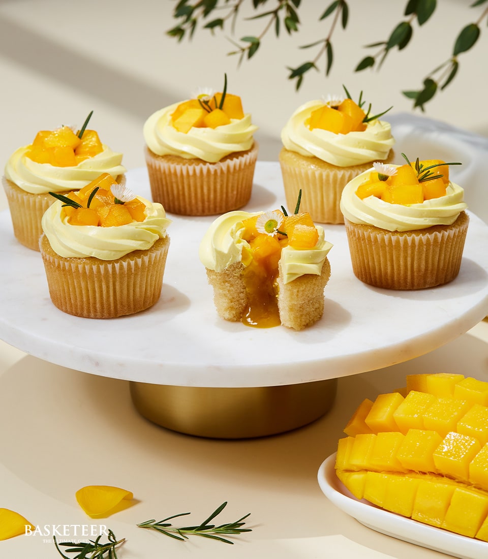 Sweet Summer Cupcakes Gift Sweet Summer Cupcakes Gift Indulge in our delicious vanilla cupcakes, each topped with creamy yellow frosting, fresh mango pieces, and adorned with small white flowers. Perfectly presented on a white marble cake stand, these tropical-themed cupcakes are ideal for any special occasion or celebration. Order now to enjoy a delightful blend of vanilla and mango flavors.
