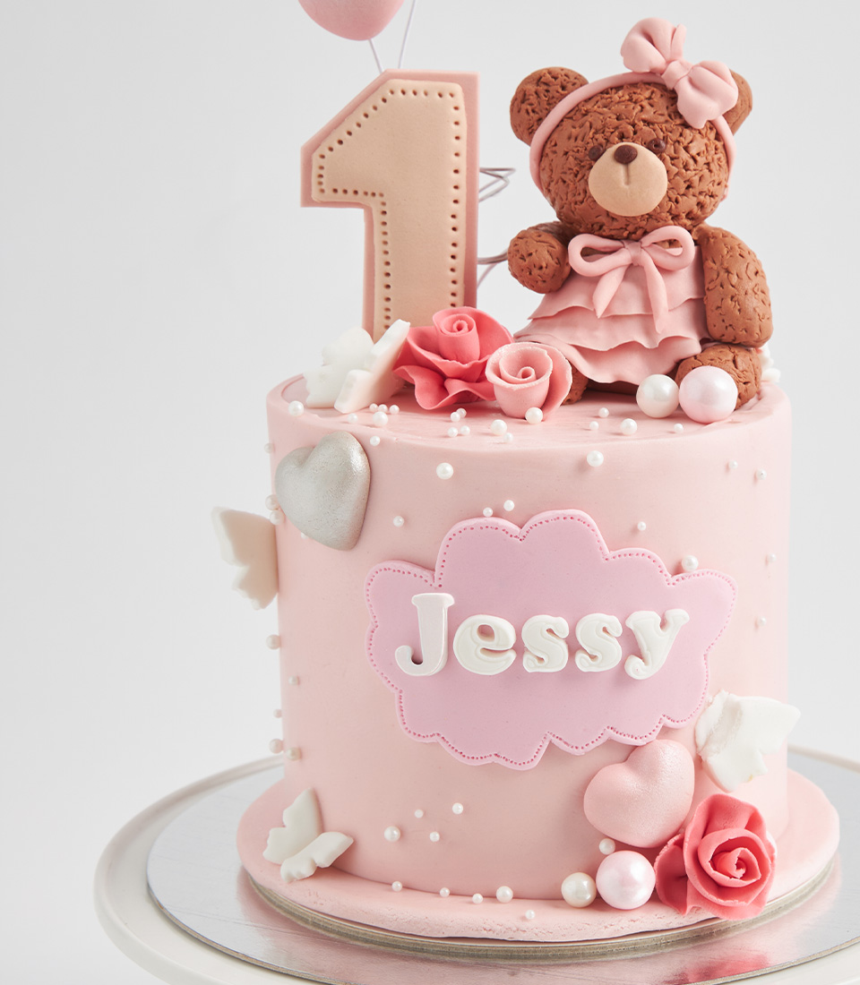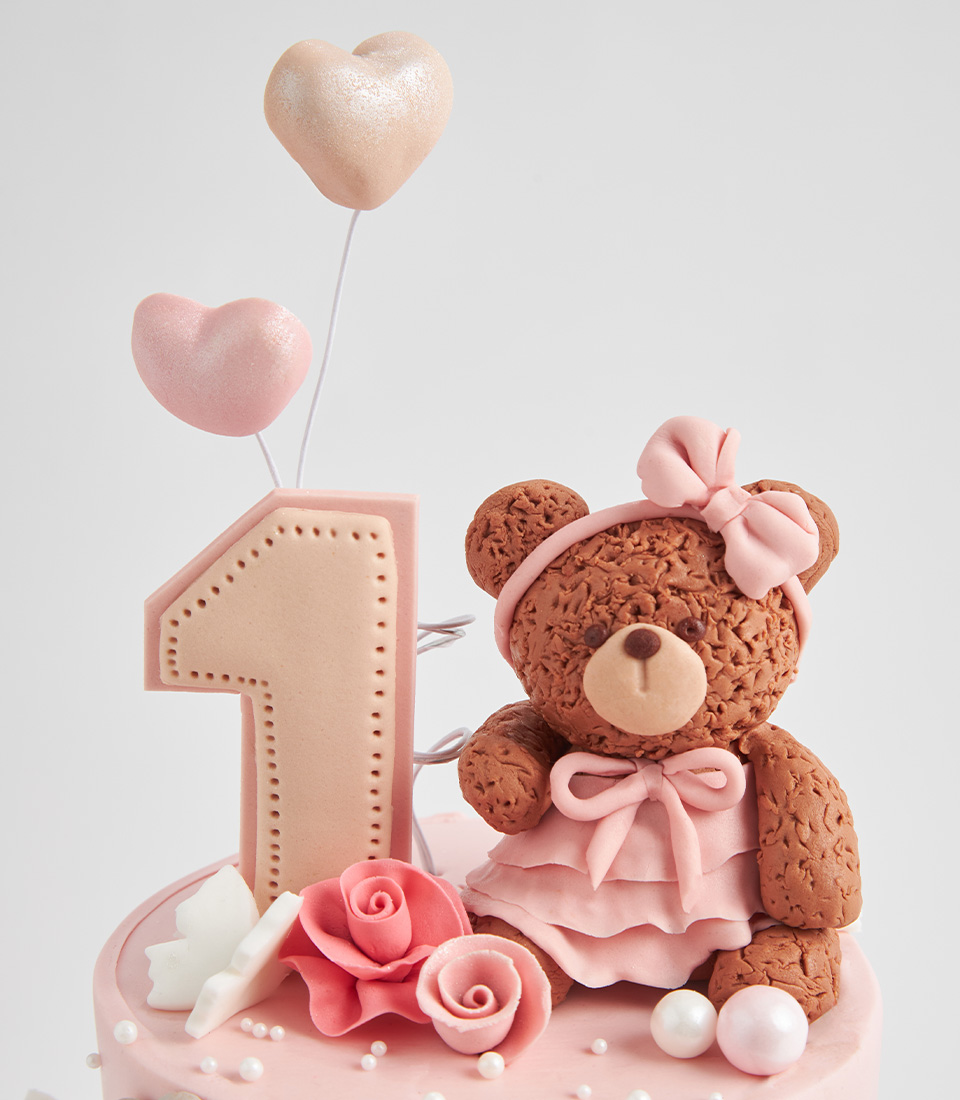 A pastel pink vanilla cake with teddy bear topper, cloud name tag, and birthday number—ideal for baby girls' special days.