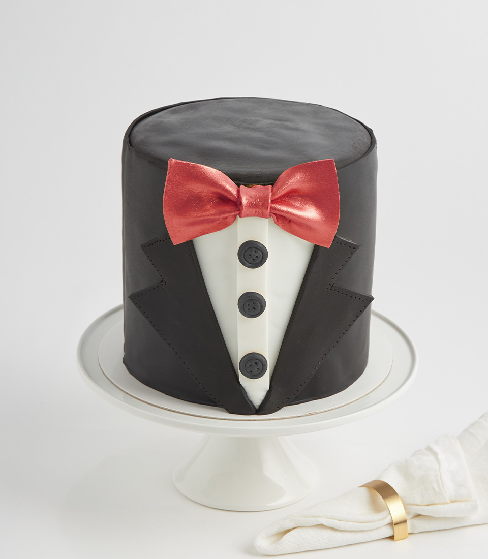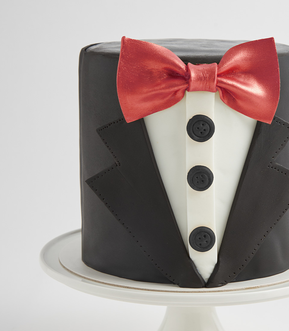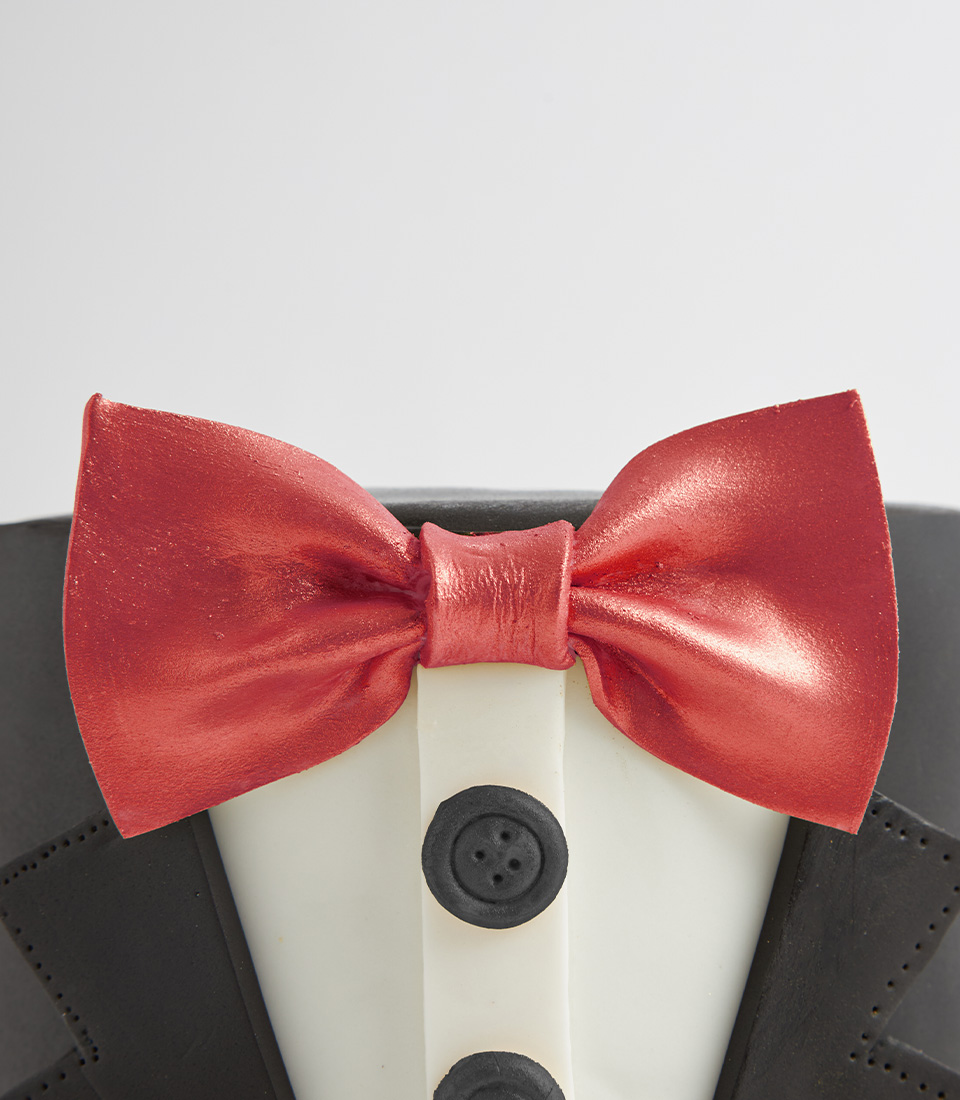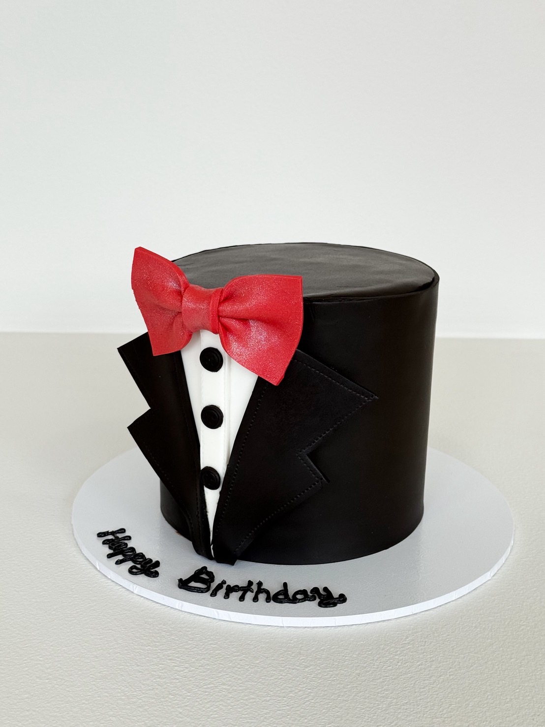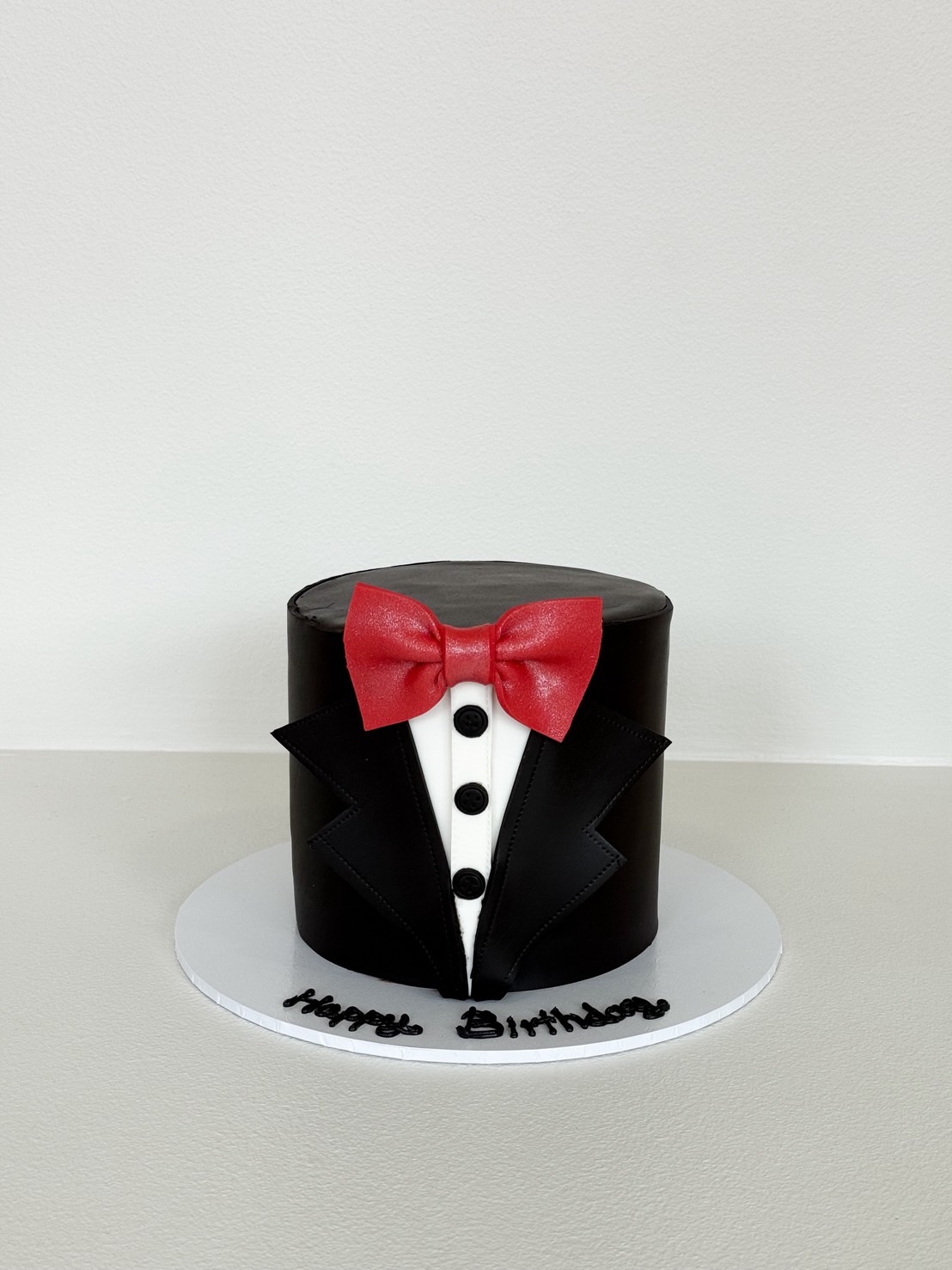 Celebrate in style with a Tuxedo cake featuring a red bow, soft vanilla sponge, and elegant fondant details — perfect for any occasion.