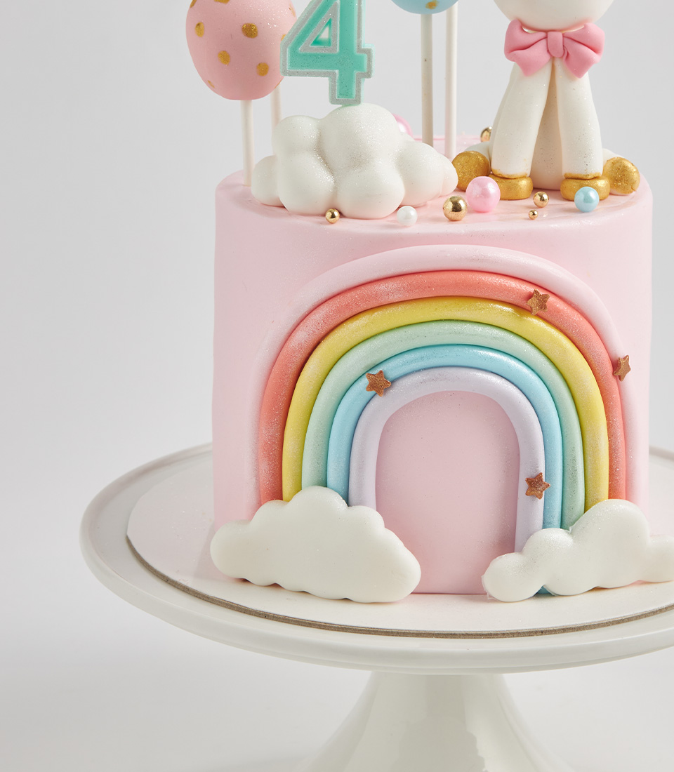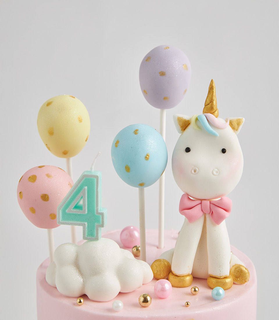 Pastel rainbow vanilla sponge cake with unicorn topper, clouds, and balloons—perfect for adding magic to any birthday celebration.