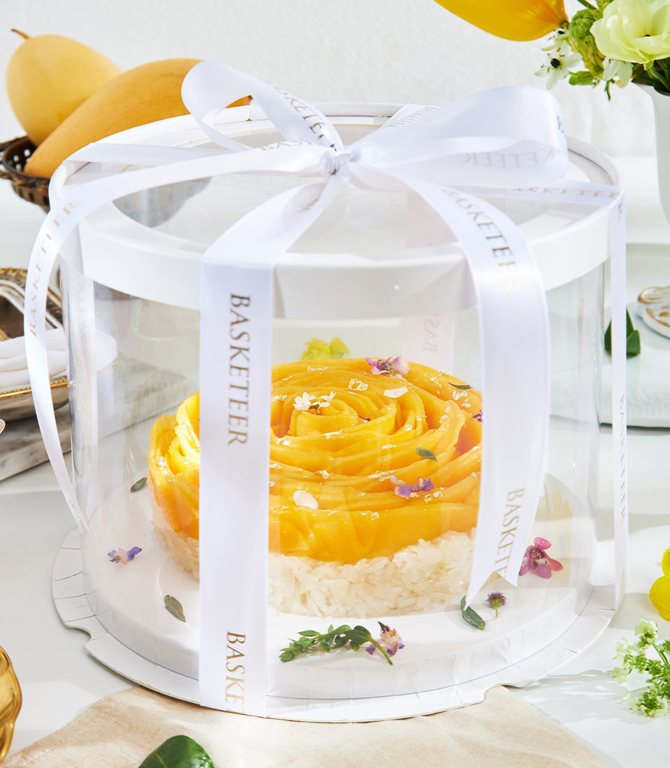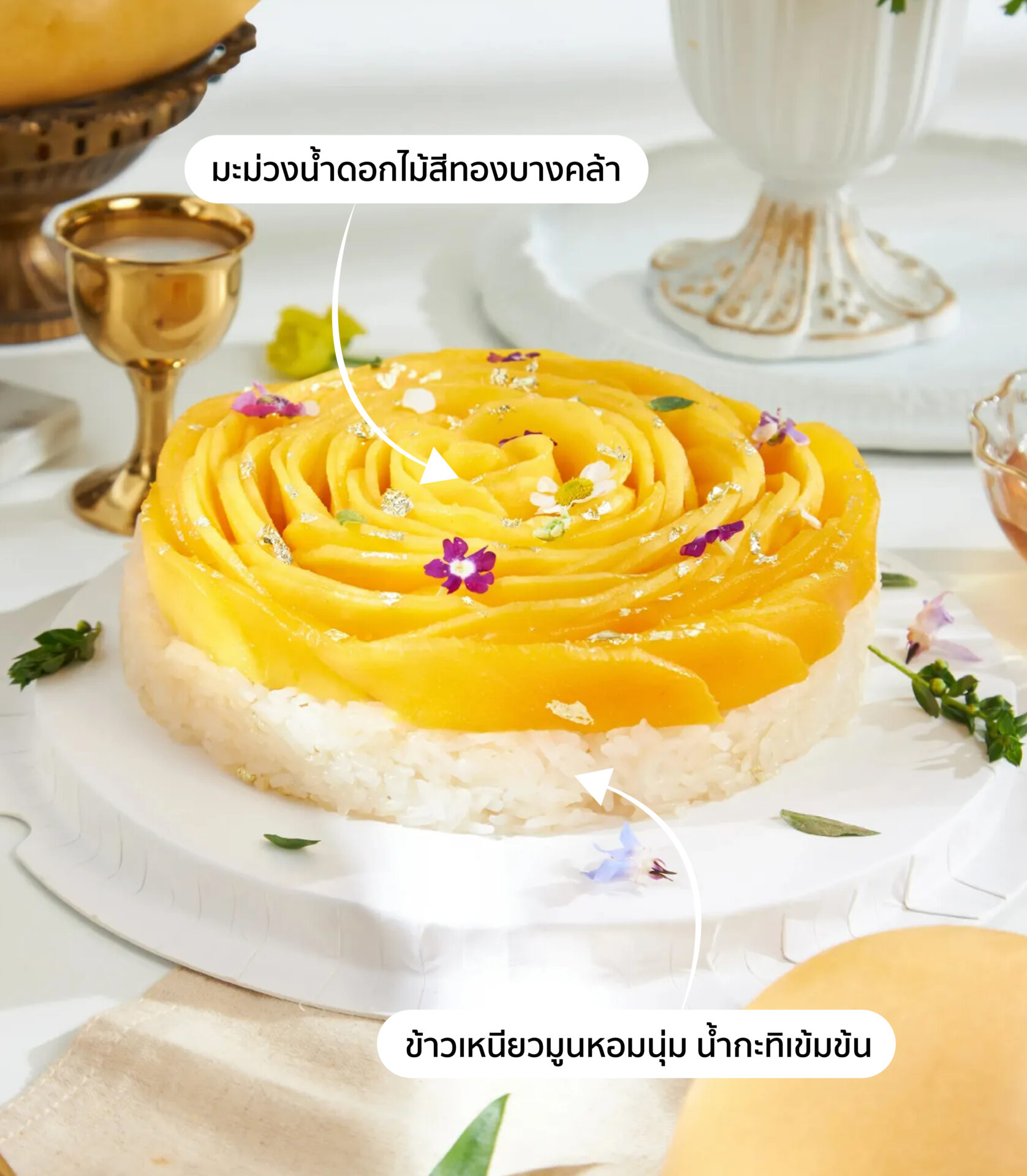 Enjoy the Golden Rose Mango Sticky Rice Cake, made with premium Nam Dok Mai Mangoes and creamy Snow Pearl Sticky Rice in a rose design.