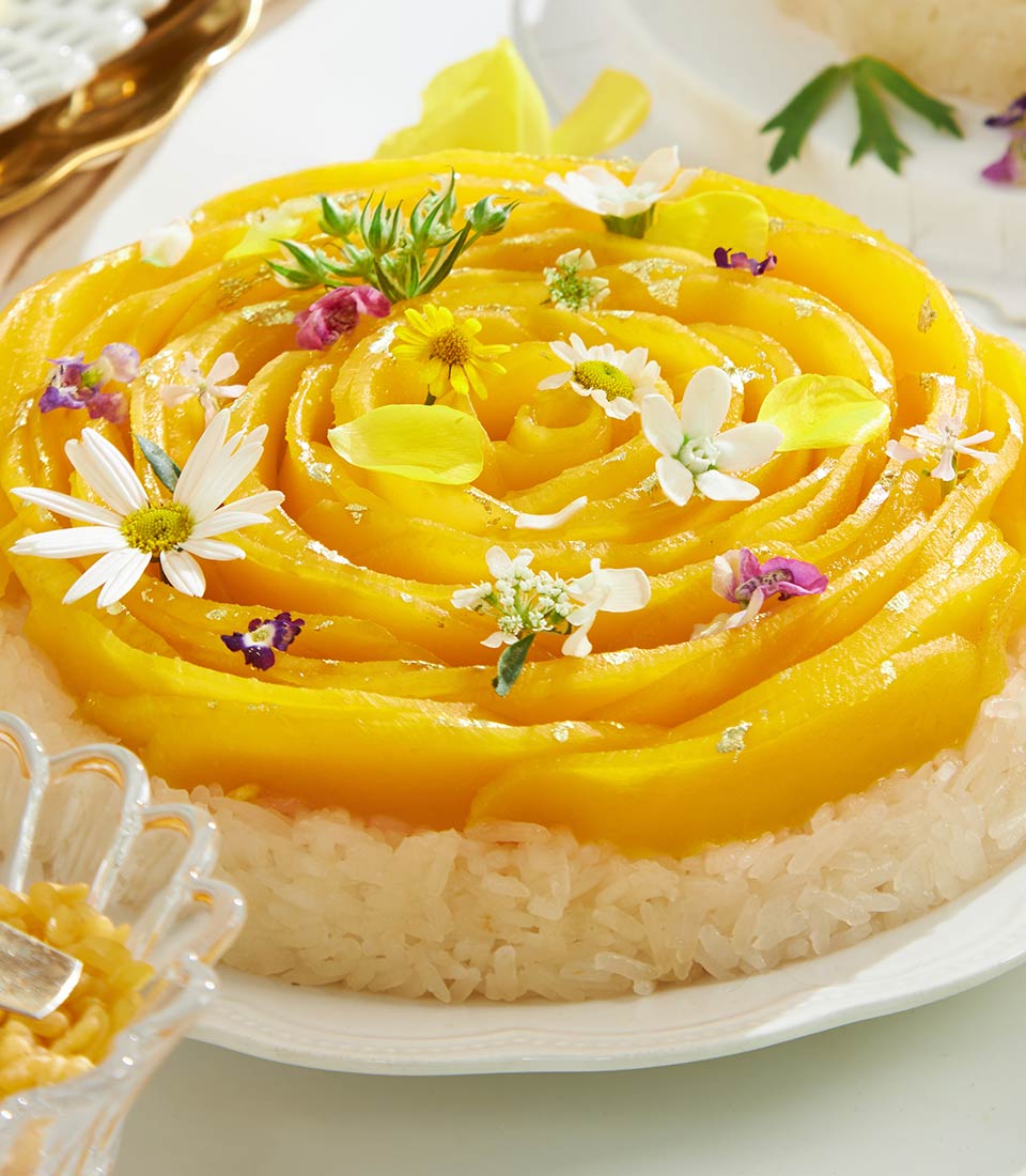 Golden Rose Mango Sticky Rice Cake The Golden Rose Mango Sticky Rice Cake is a luxurious twist on Thailand's classic dessert. Made with hand-cut Nam Dok Mai mangoes, creamy snow pearl sticky rice, and a touch of edible gold, it offers a perfect blend of artistry and authentic flavor, ideal for celebrations and special occasions.