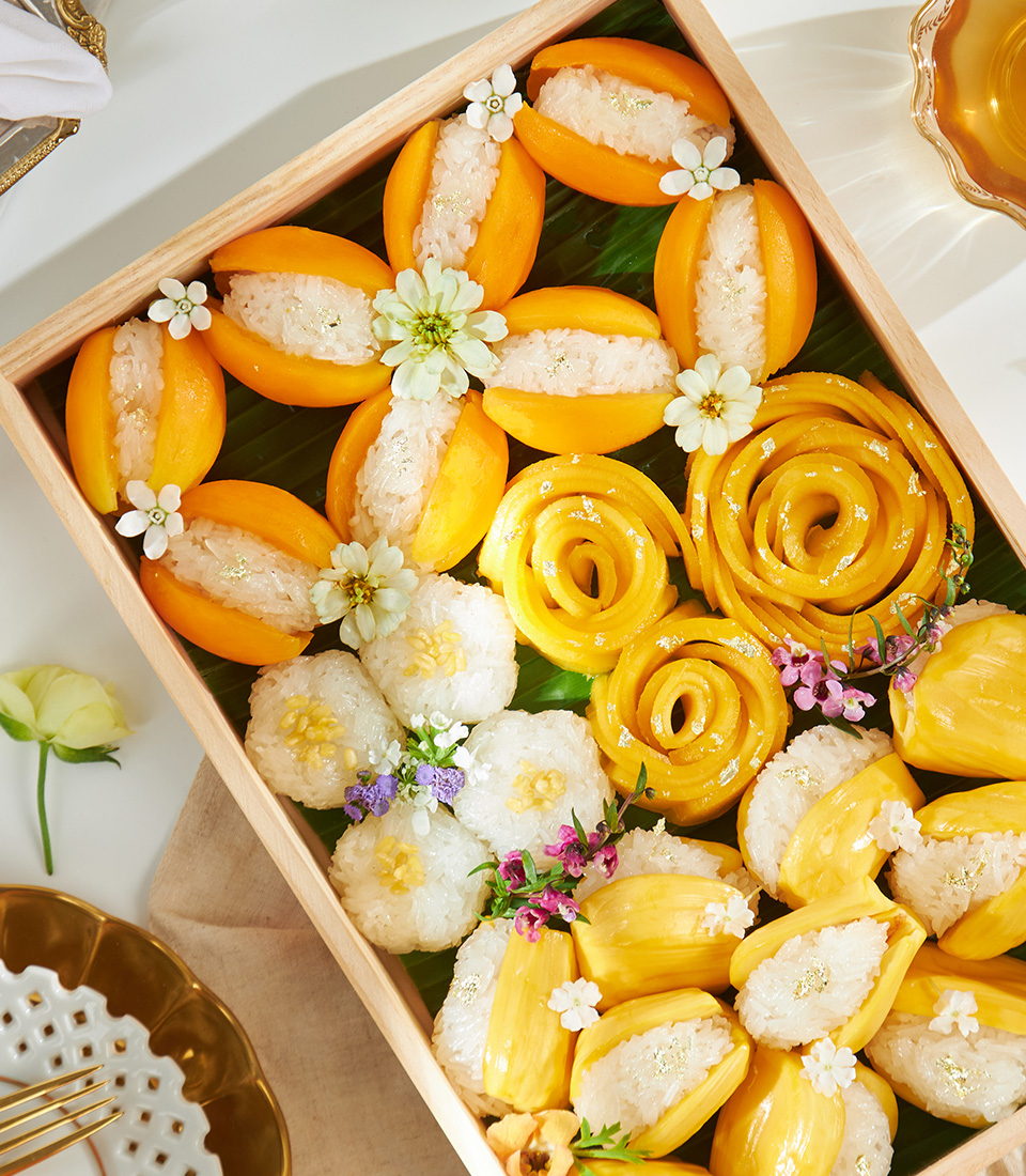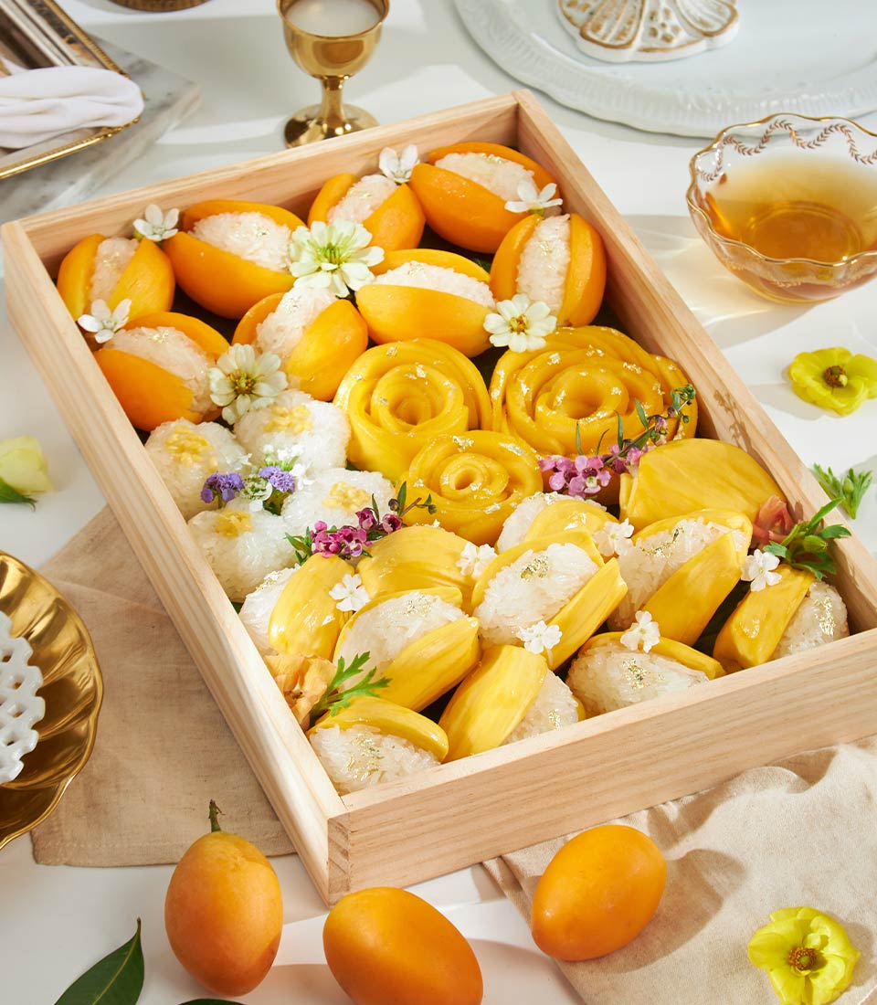 Experience Thai tradition with our Golden Thai Fruit & Sticky Rice Box, featuring Mayongchids, Nam Dok Mai Mangoes & Snow Pearl Sticky Rice.