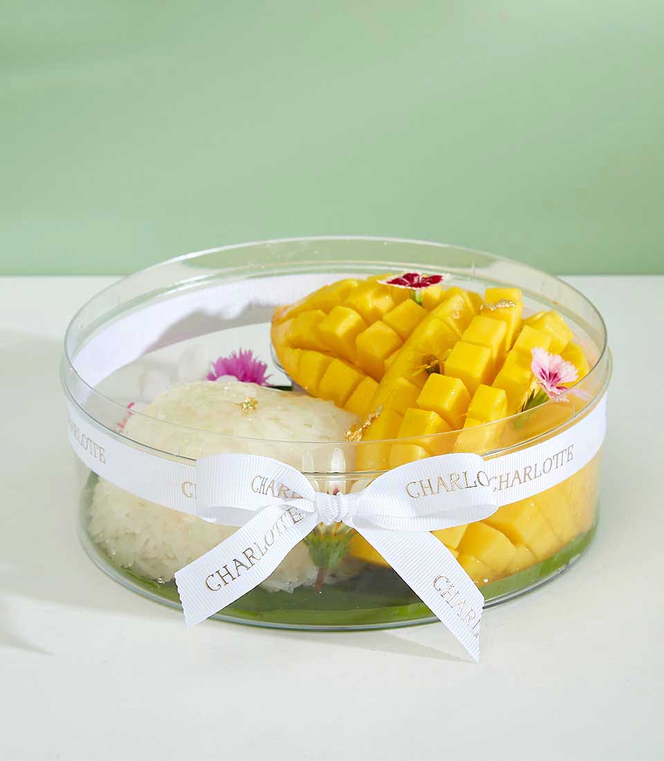 Indulge in the finest Thai mango sticky rice, elegantly packed with golden accents. A perfect luxurious gift for dessert lovers.
