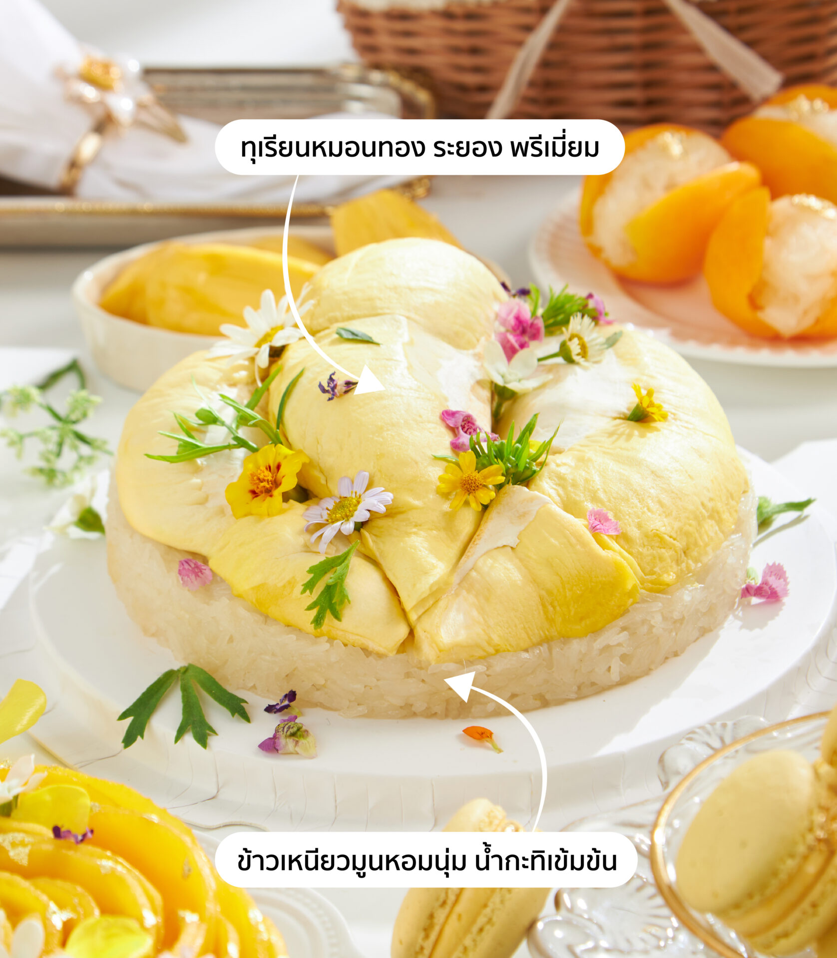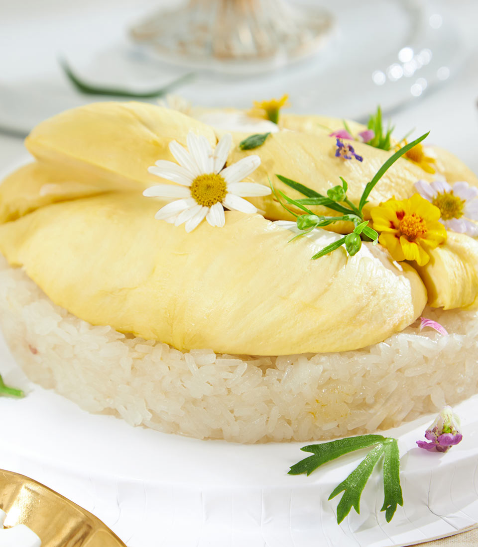 Savor the creamy richness of Premium Rayong Mon Thong Durian paired with smooth, aromatic Moon Sticky Rice for the ultimate gourmet experience.