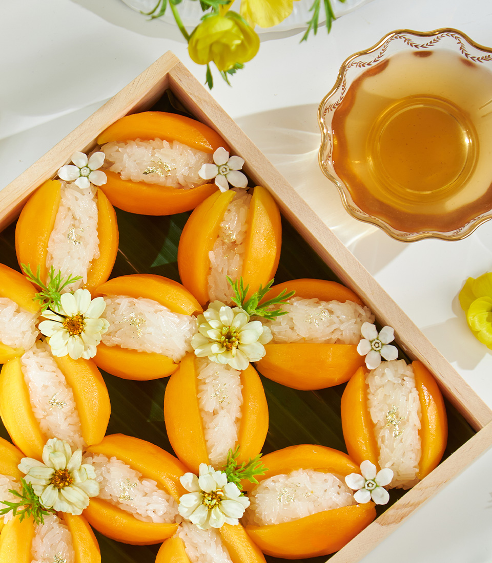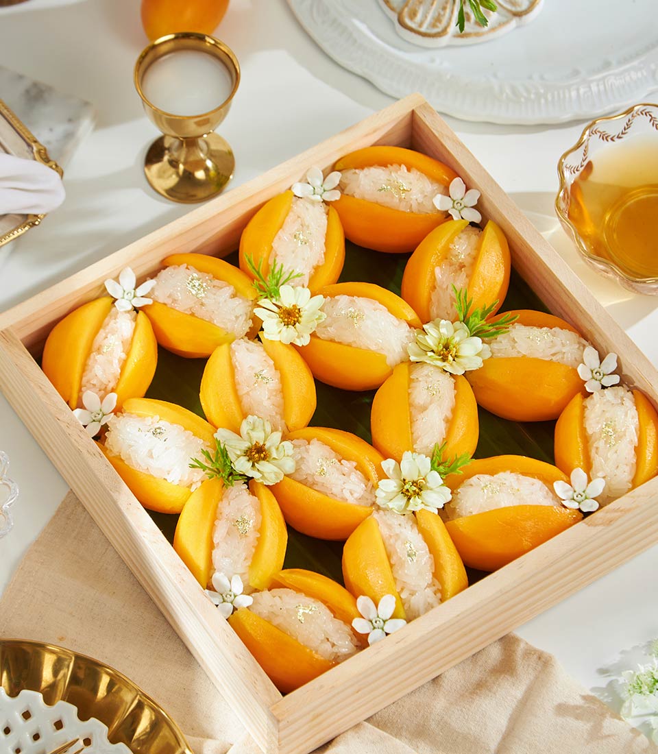 Premium Mayongchids with Sticky Rice Box Indulge in the exquisite flavors of our Golden Mayongchid Sticky Rice Box, a luxurious twist on a beloved Thai delicacy. Each juicy, golden Mayongchid (Marian Plum) is carefully sliced and filled with fragrant coconut-infused sticky rice, creating a perfect balance of sweetness and creaminess. Adorned with edible gold flakes and delicate flowers, this dessert is both visually stunning and irresistibly delicious.