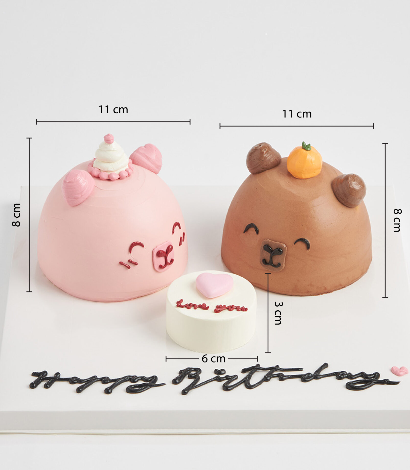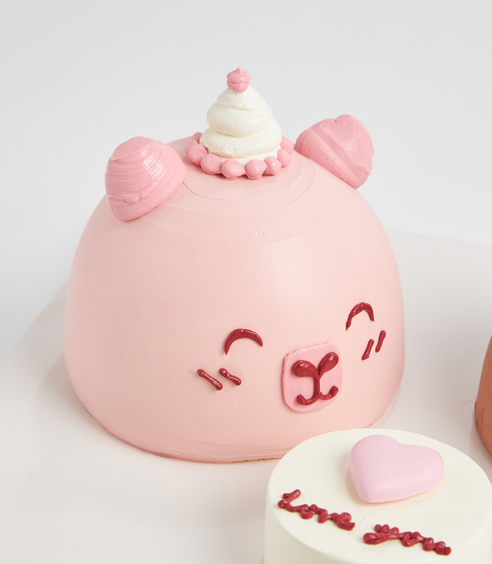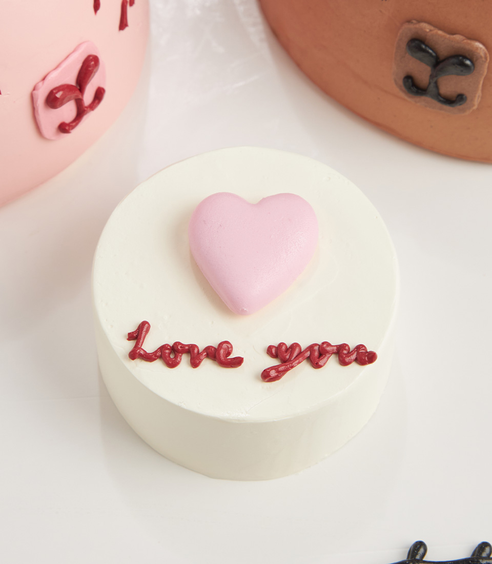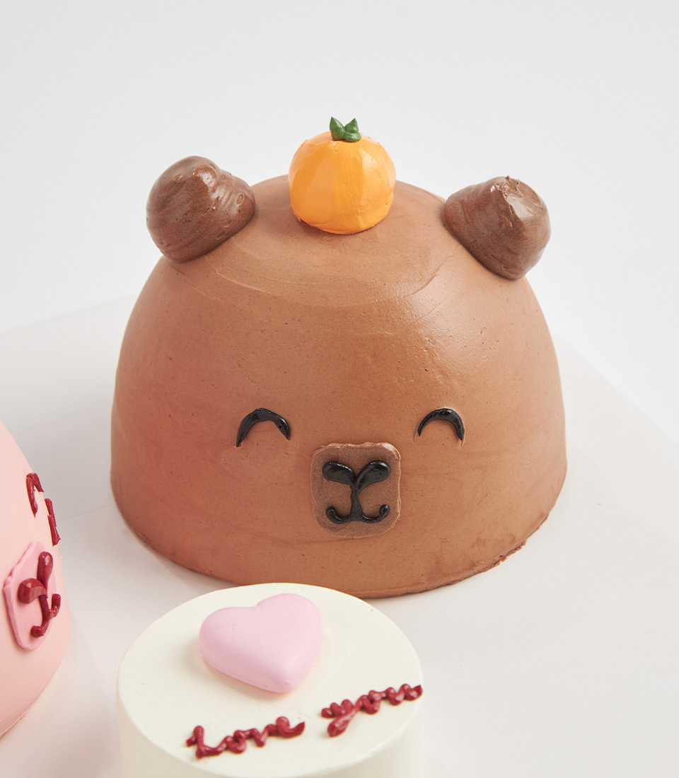 Little Bear Mini Cakes Fall in love with these adorable mini dome cakes, each topped with a sweet pink bear and a cuddly brown bear, finished in smooth buttercream. At the center, a lovely cake says “Love You” — the perfect treat for birthdays, anniversaries, or surprise moments.