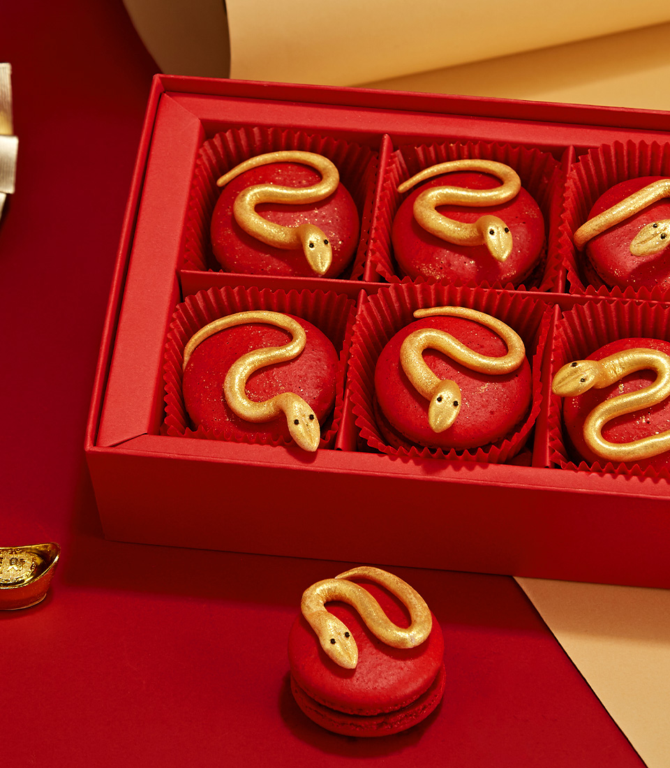 Celebrate 2025 with our handcrafted Year of the Snake macarons. Vibrant red shells with golden snake designs, perfect for Lunar New Year gifting.