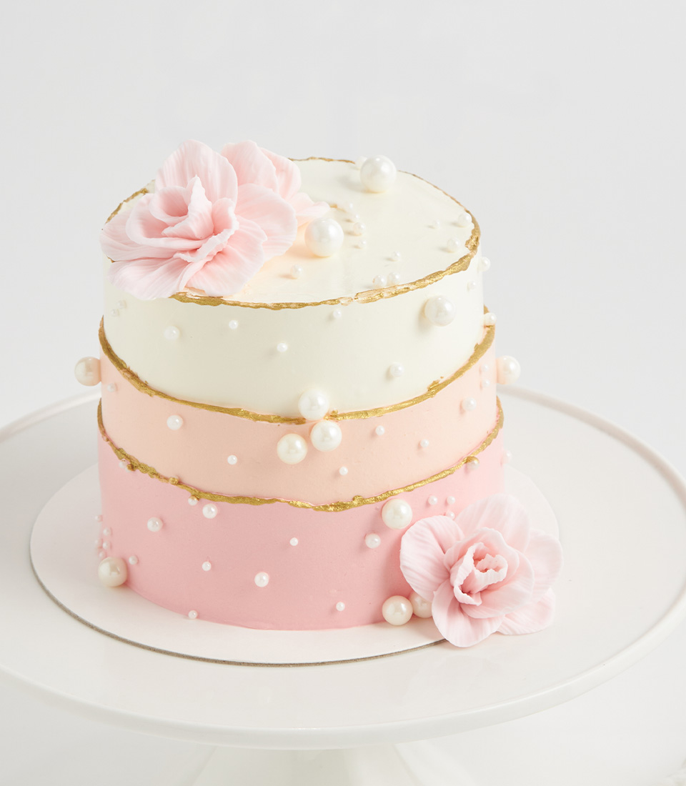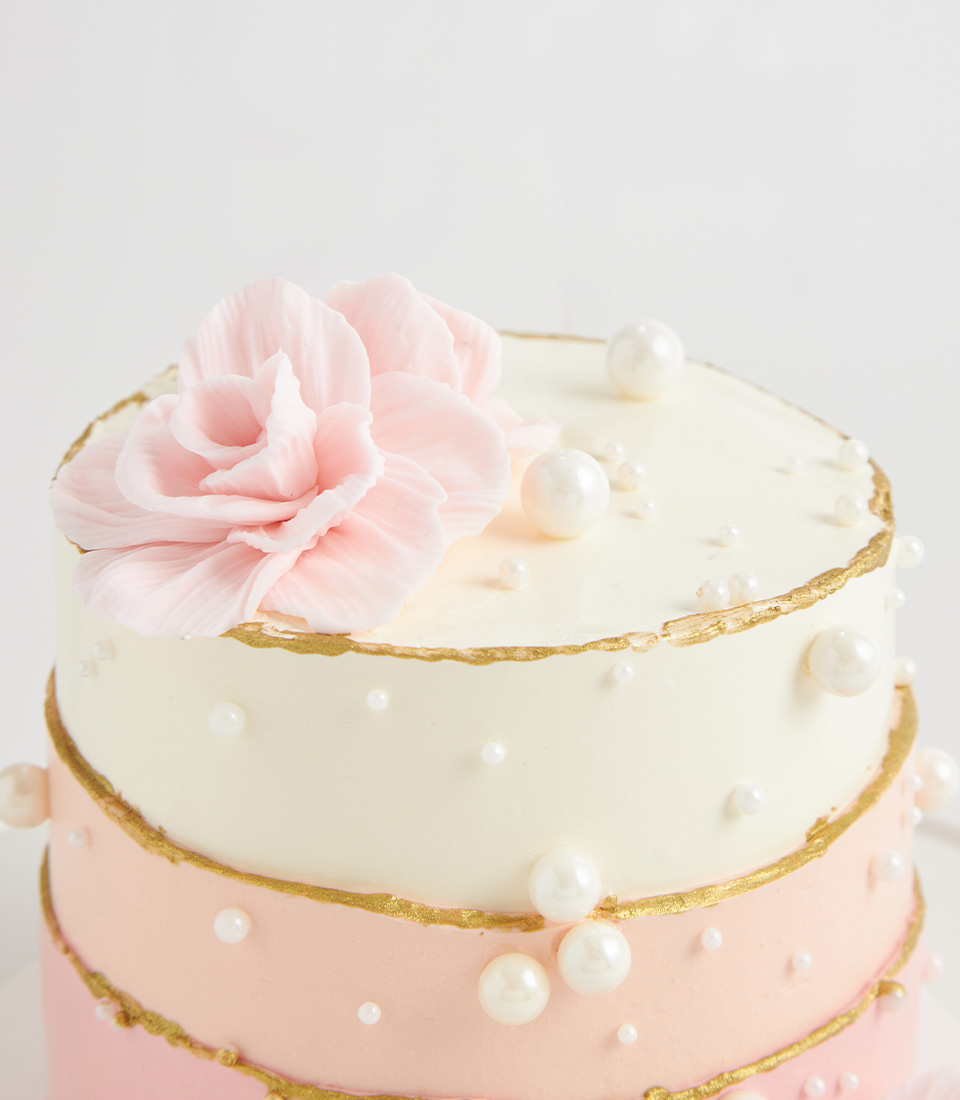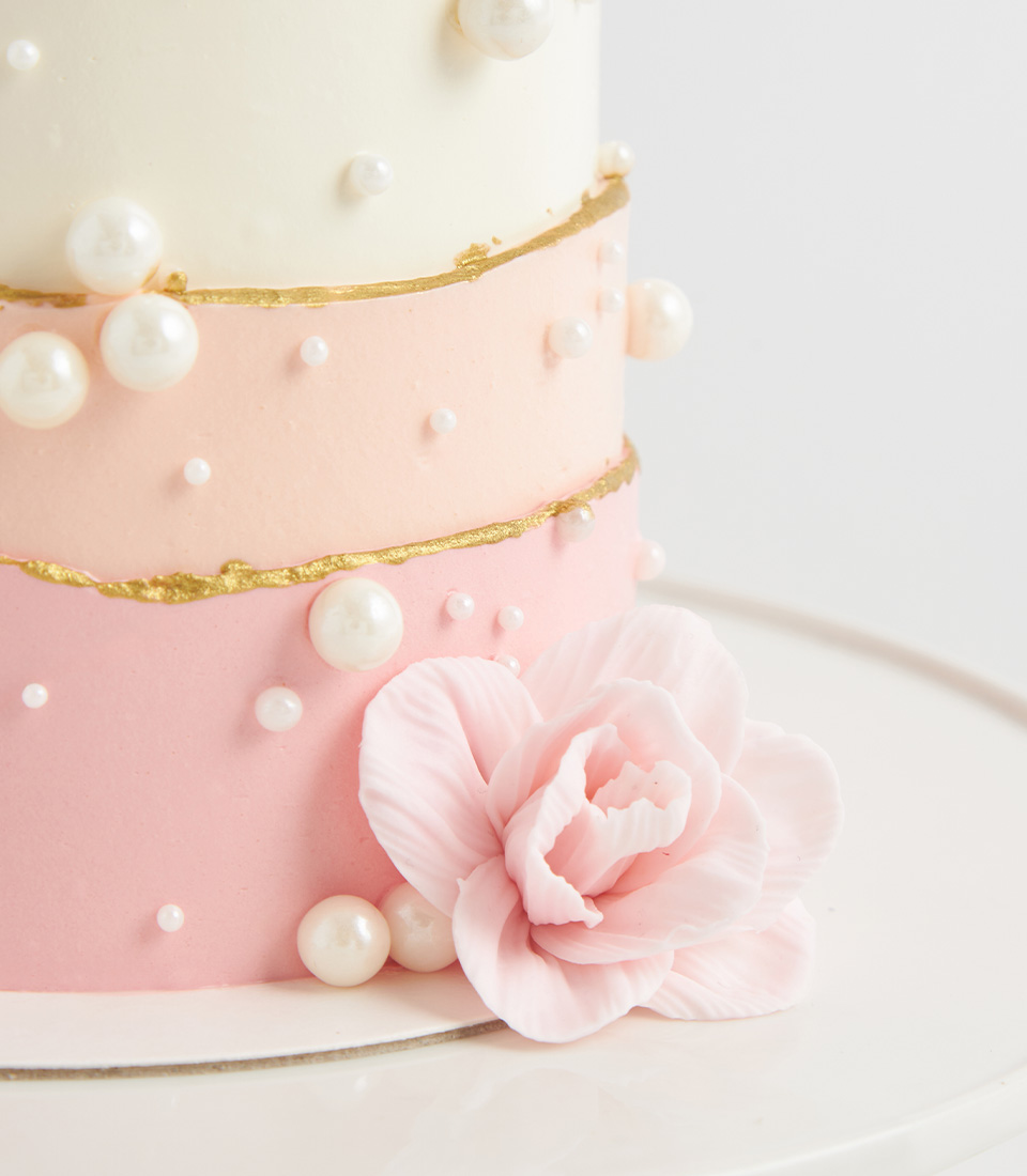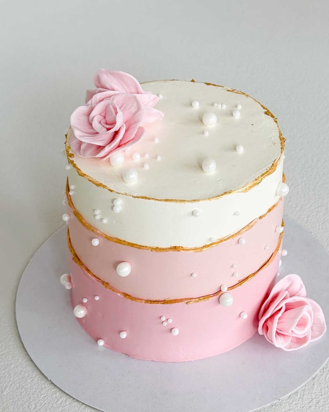 Elegant Pearl Birthday Cake Indulge in a dreamy delight — this three-tone vanilla sponge cake is wrapped in ombré fondant, crowned with sugar pearls and handcrafted fondant flowers. Perfect for birthdays, bridal showers, or elegant gatherings.