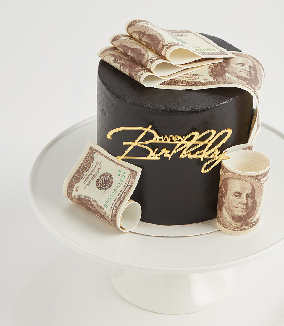Edible Money Cake – Lucky Rich Design This luxurious Nutella sponge cake, wrapped in sleek black fondant and adorned with edible money notes. Topped with a shimmering gold “Happy Birthday” sign, it’s the ultimate centrepiece for stylish celebrations.