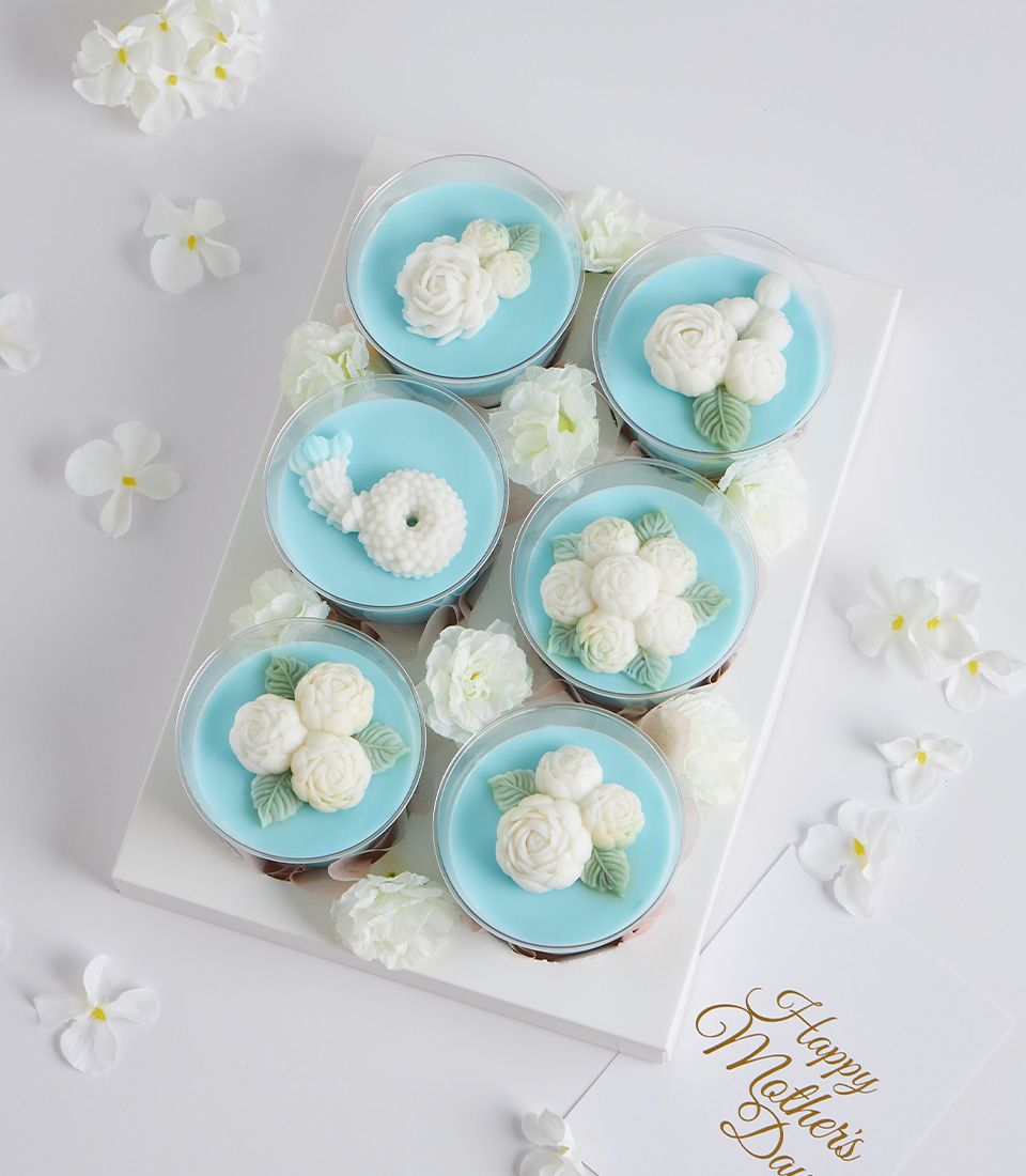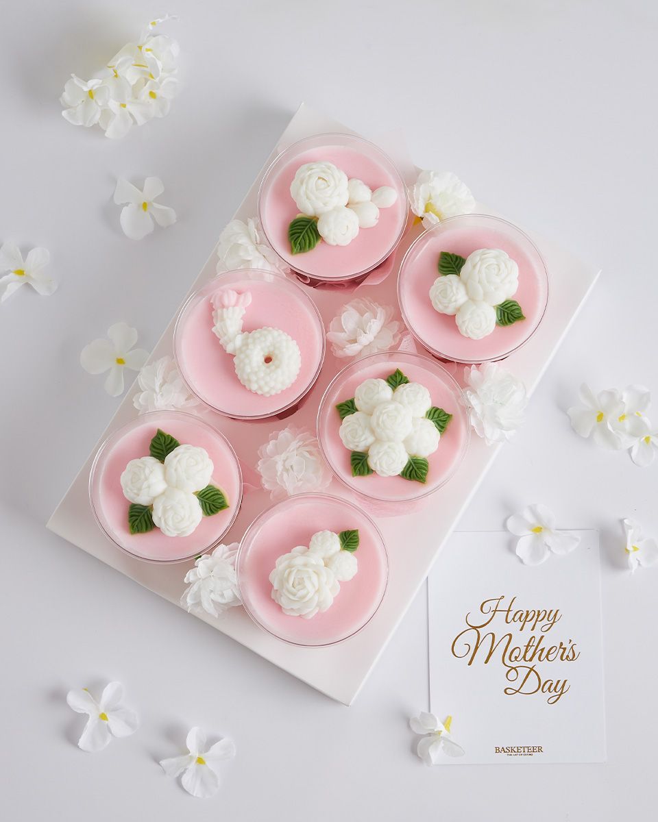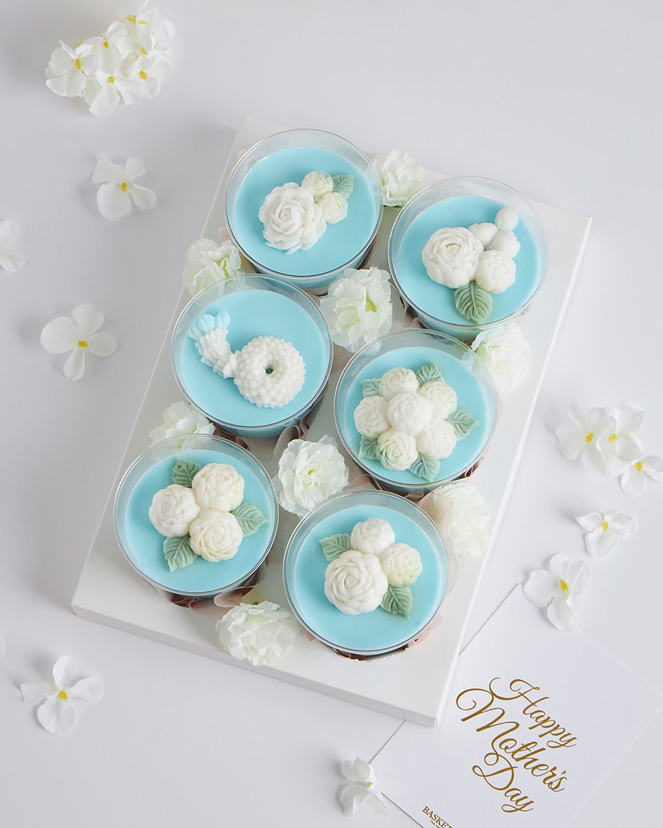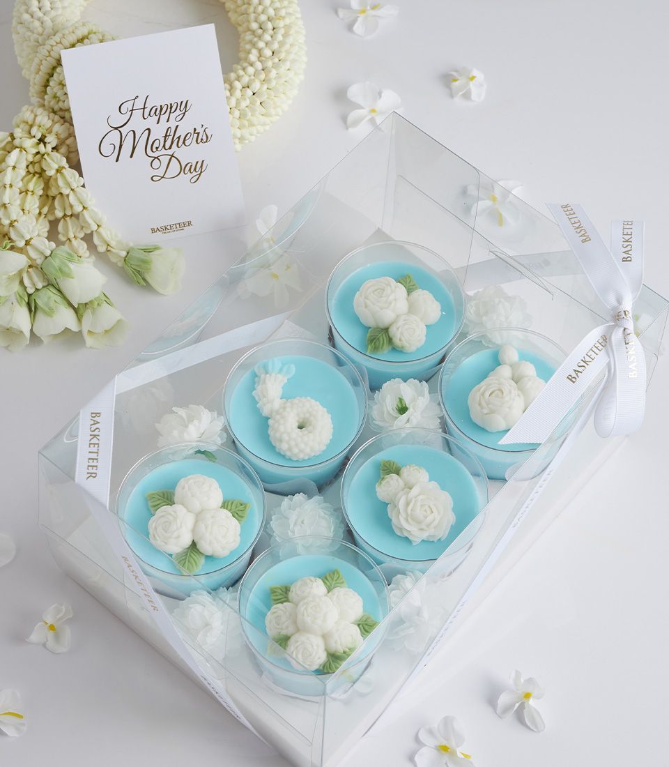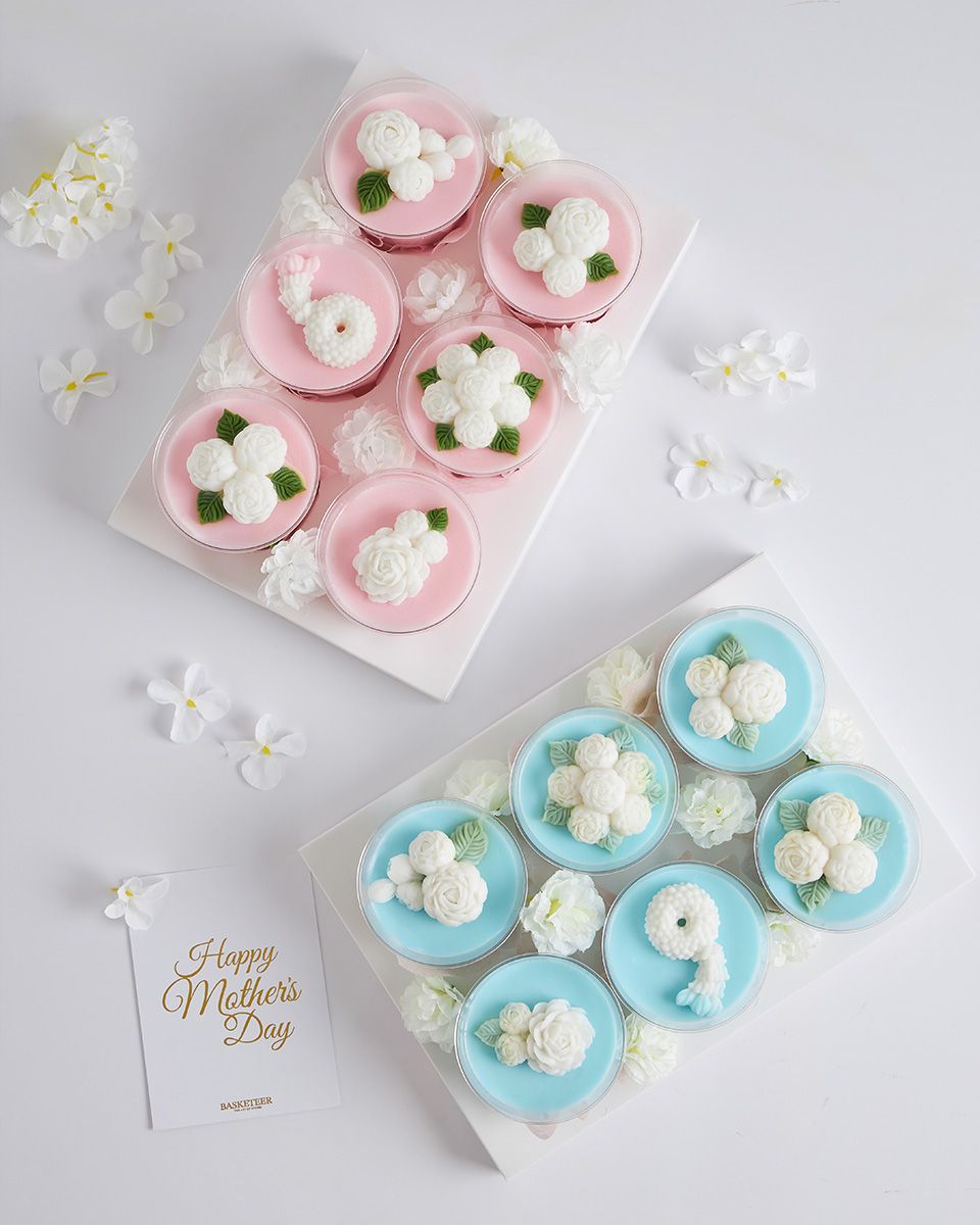 Mini Coconut Jelly Dessert Set for Mum’s Special Day Surprise Mum this Mother’s Day with a blue and pink coconut jelly gift set, beautifully adorned with jasmine flowers. Made from premium Thai coconut milk, it’s a heartfelt gift that celebrates Thai tradition with a delicate, elegant touch — perfect for honouring your beloved mother.