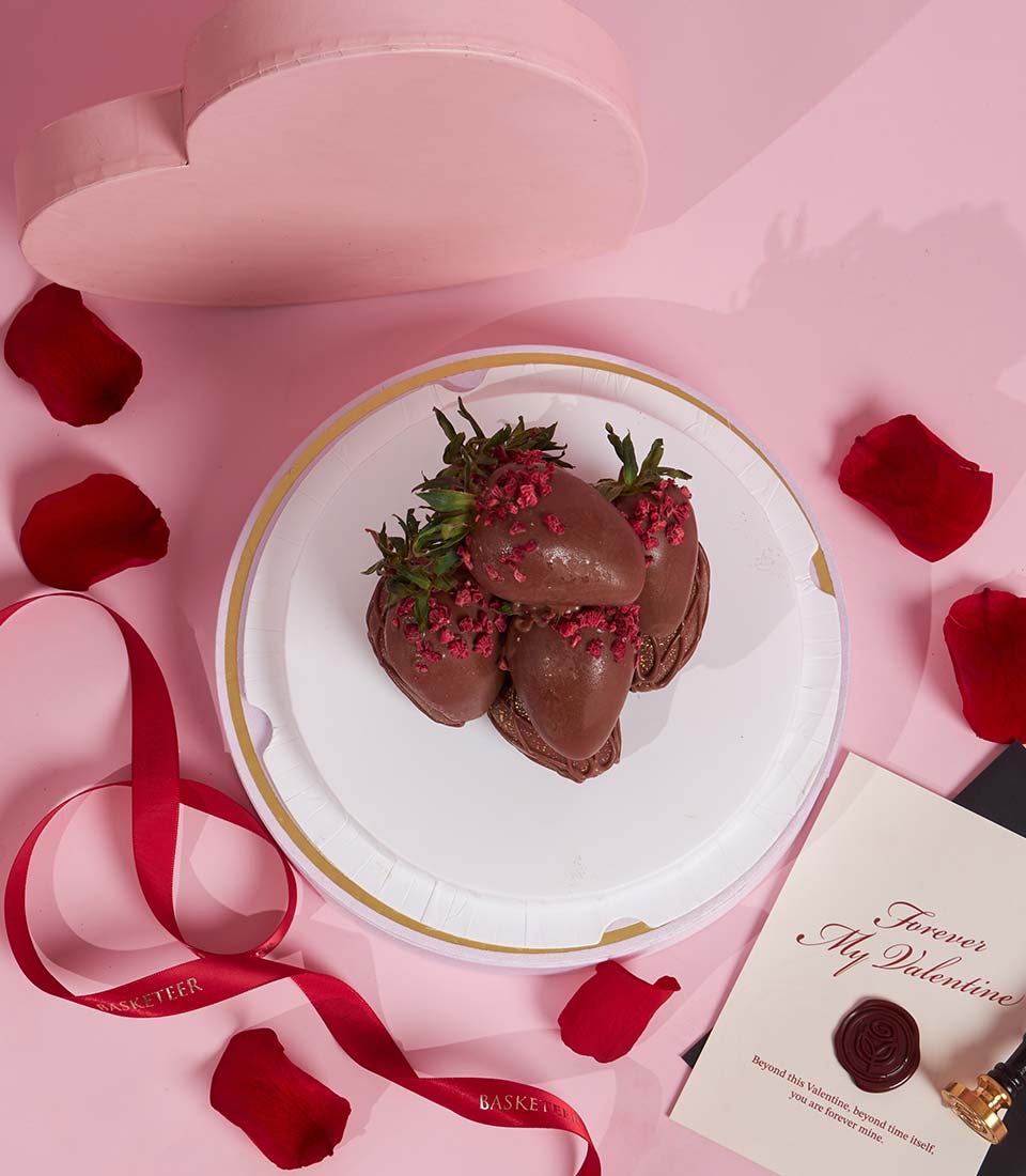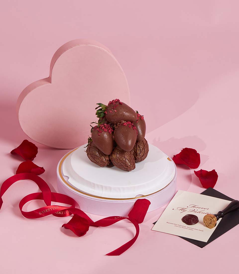 An elegant box of premium dark chocolate-covered strawberries, beautifully presented for a romantic Valentine gift. A luxurious sweet surprise for unforgettable moments.