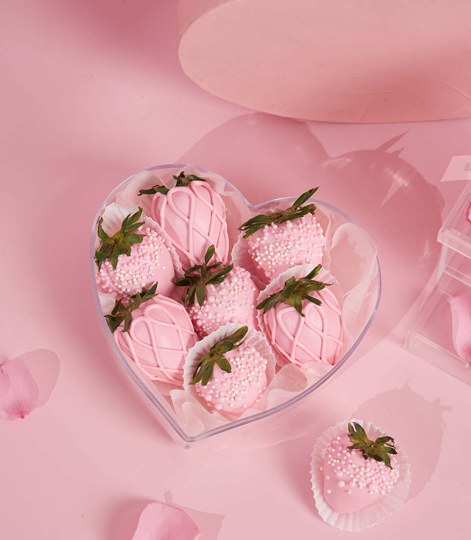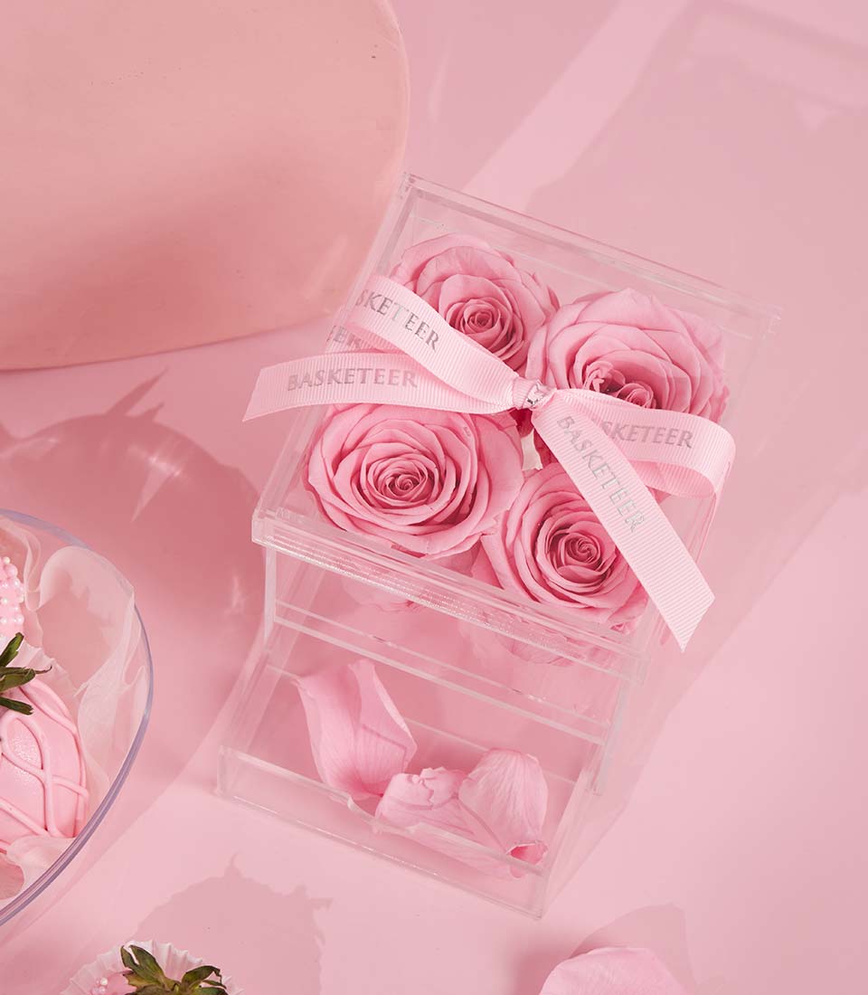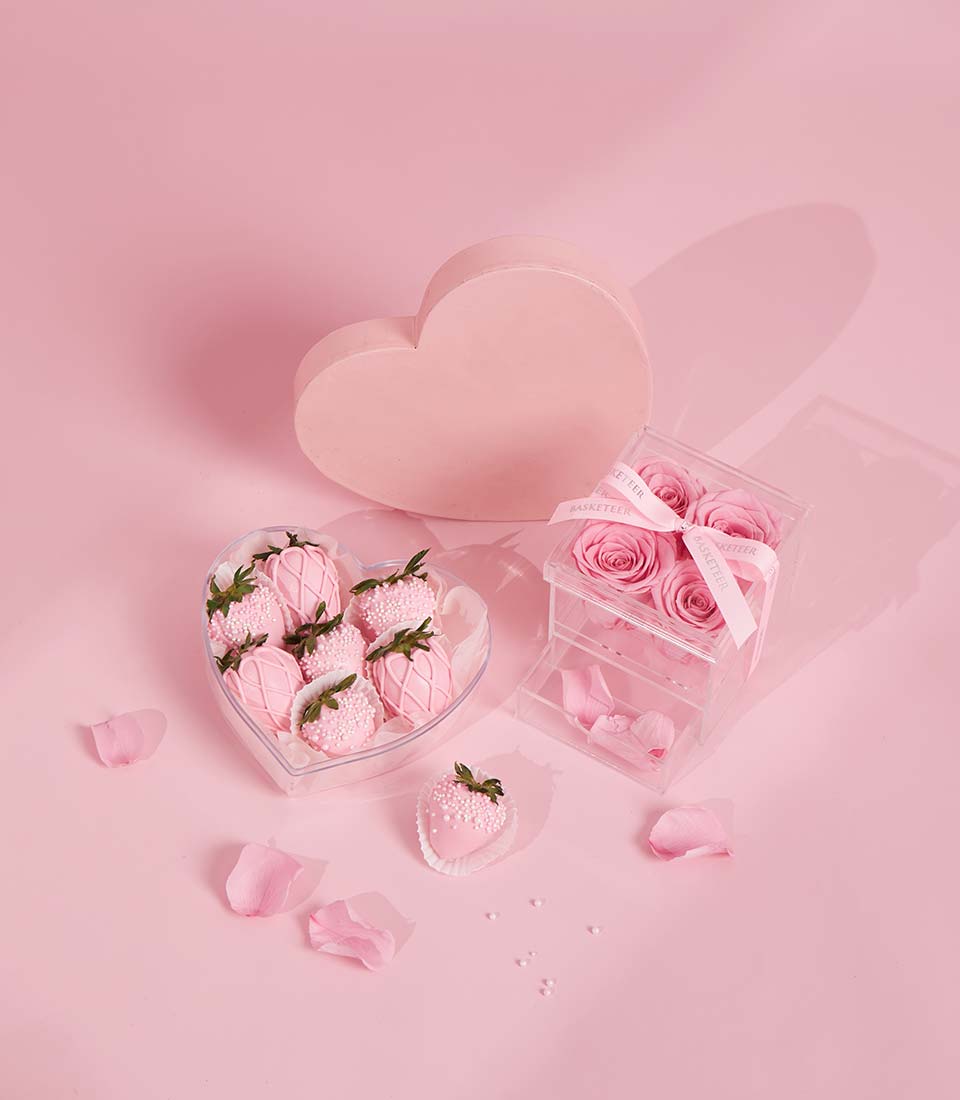 A romantic Valentine gift set featuring chocolate-covered strawberries and preserved pink roses. Sweet, elegant, and thoughtfully designed to create a memorable Valentine surprise for someone special.