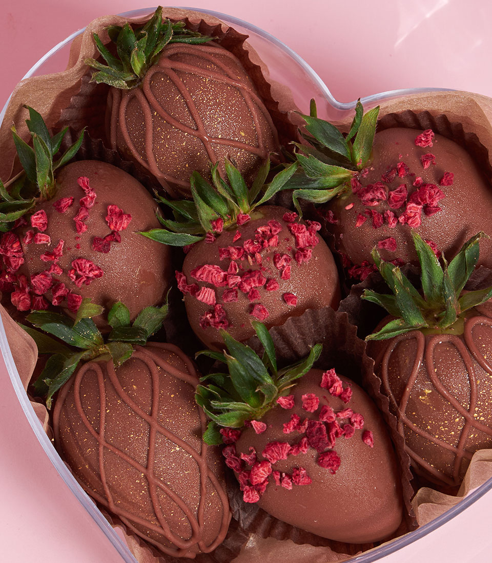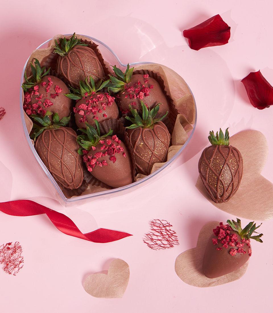 Indulge in a romantic Valentine gift of premium strawberries coated in rich dark chocolate and elegantly arranged in a heart-shaped box. A luxurious sweet treat designed to impress and delight, perfect for expressing love on Valentine’s Day.