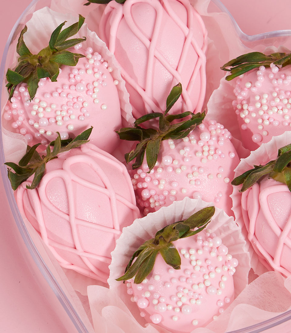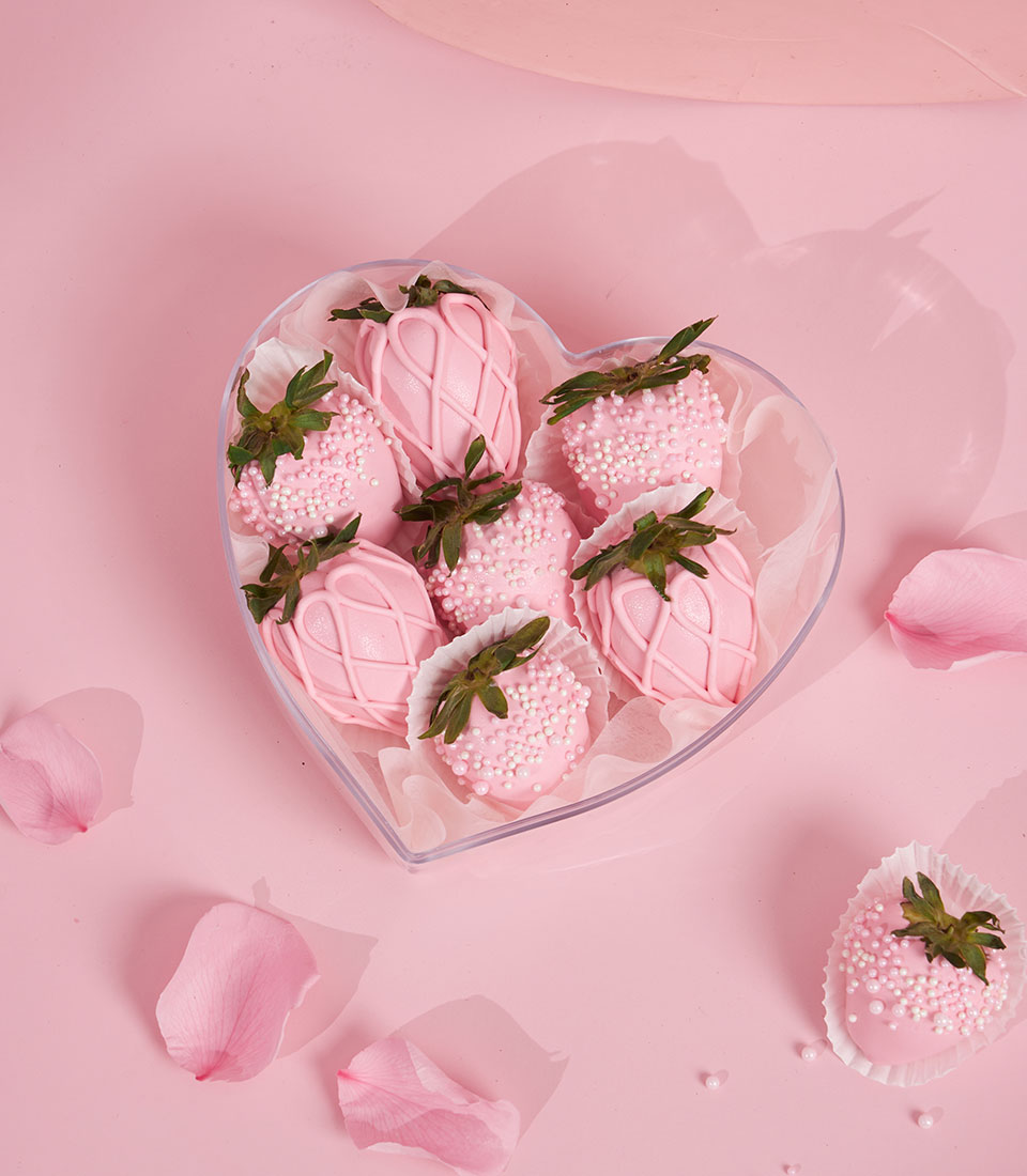 A romantic Valentine gift featuring fresh strawberries dipped in smooth pink chocolate and delicately decorated. Presented in an elegant heart-shaped box, this sweet treat is perfect for expressing love and sending a charming Valentine surprise in Bangkok.