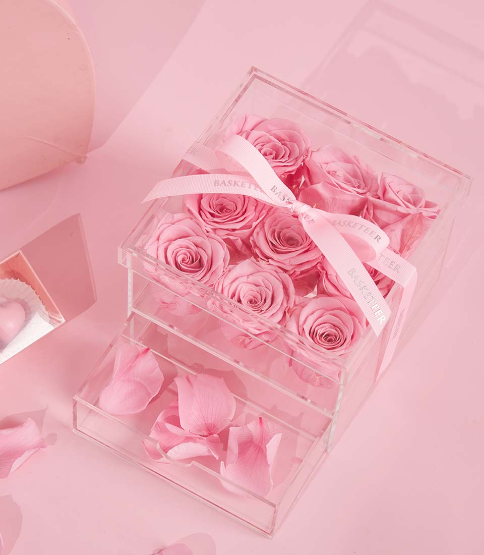 A sweet and romantic Valentine gift set featuring Charlotte pink raspberry passion bonbons paired with preserved pink roses in an elegant acrylic box. Thoughtfully designed to create a lasting impression, this Valentine gift is perfect for expressing love, appreciation, and heartfelt affection on the most romantic day of the year.