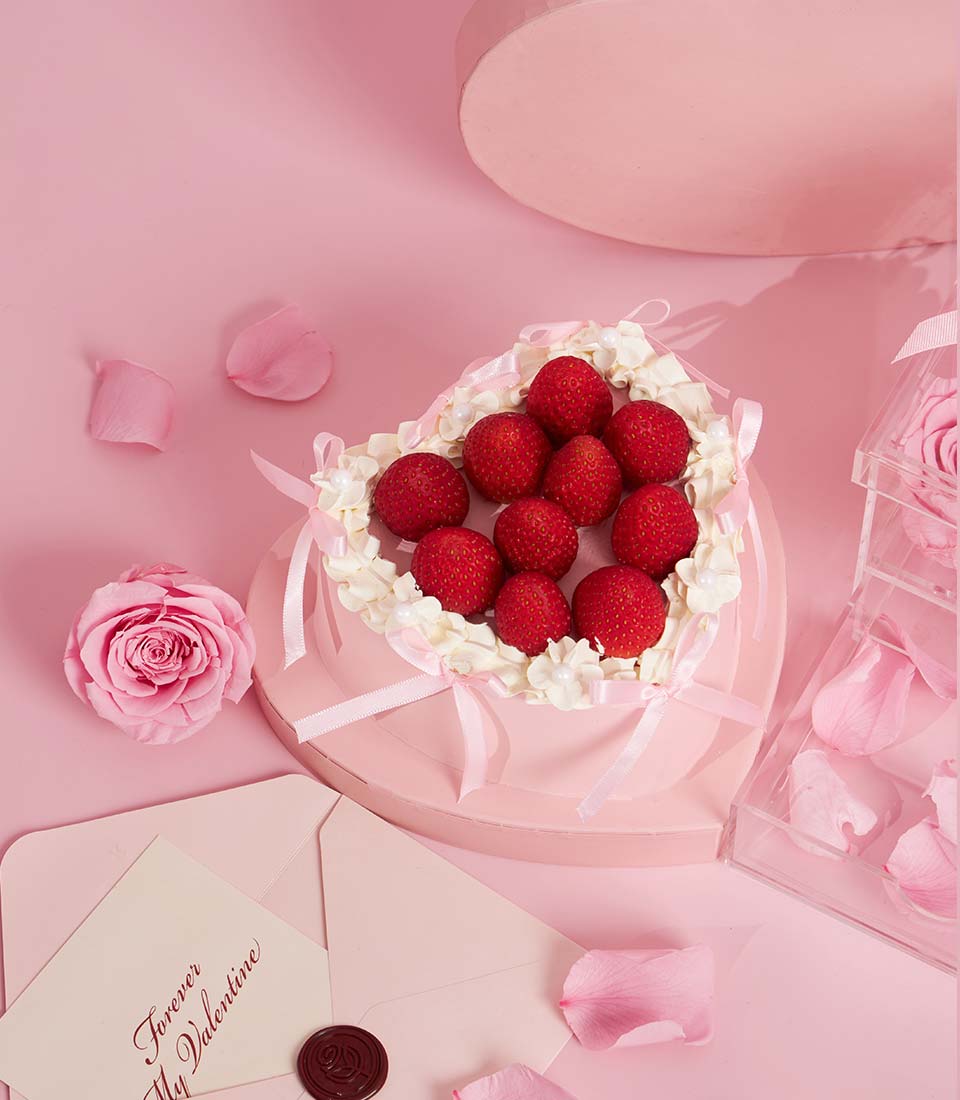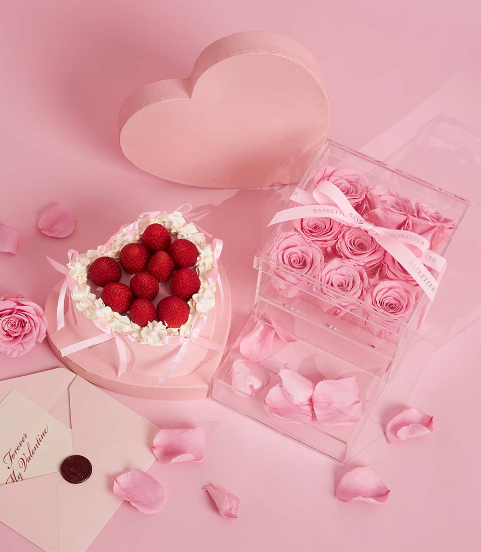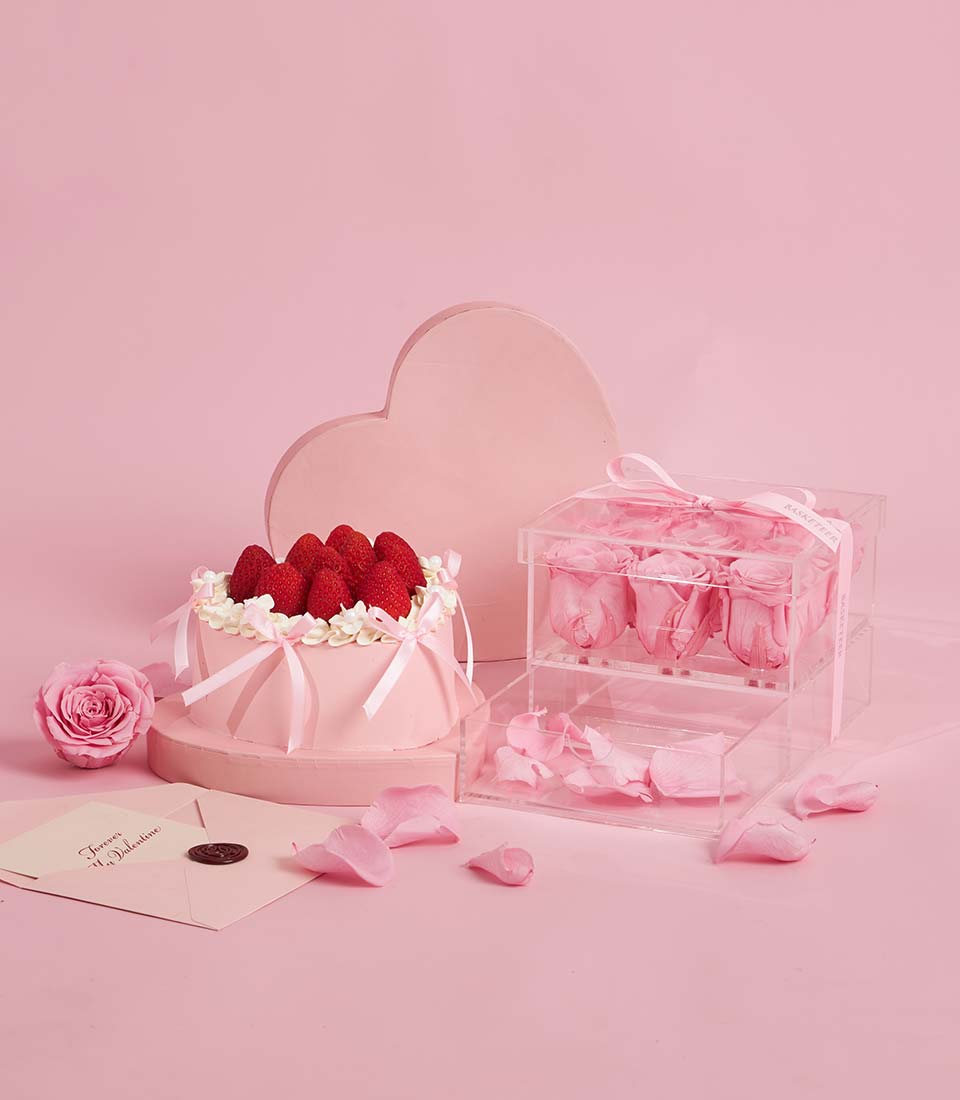 A romantic Valentine gift set featuring Charlotte Sweet Heart Strawberry Cake paired with preserved pink roses in an elegant acrylic box. Designed to create a memorable Valentine moment, this sweet and floral gift is perfect for surprising someone special and expressing love in the most thoughtful and beautiful way.
