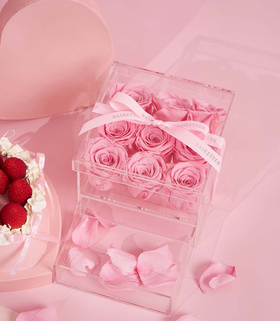 • Sweet Pink Preserved Roses (9 pcs) – Hand-selected real roses that last for years, beautifully displayed in a luxury acrylic drawer box.