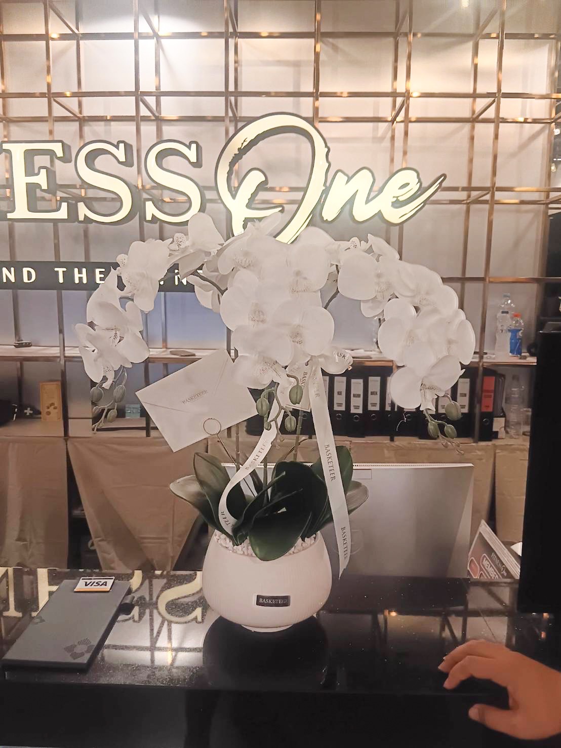 Graceful White Phalaenopsis Potted Orchids Enhance your home or office with the timeless elegance of our Graceful White Phalaenopsis Orchid. This stunning artificial orchid arrangement features delicate white blooms meticulously crafted to mimic the beauty and intricate details of real orchids. Nestled in a stylish, textured ceramic pot, this piece adds a touch of sophistication to any space.
