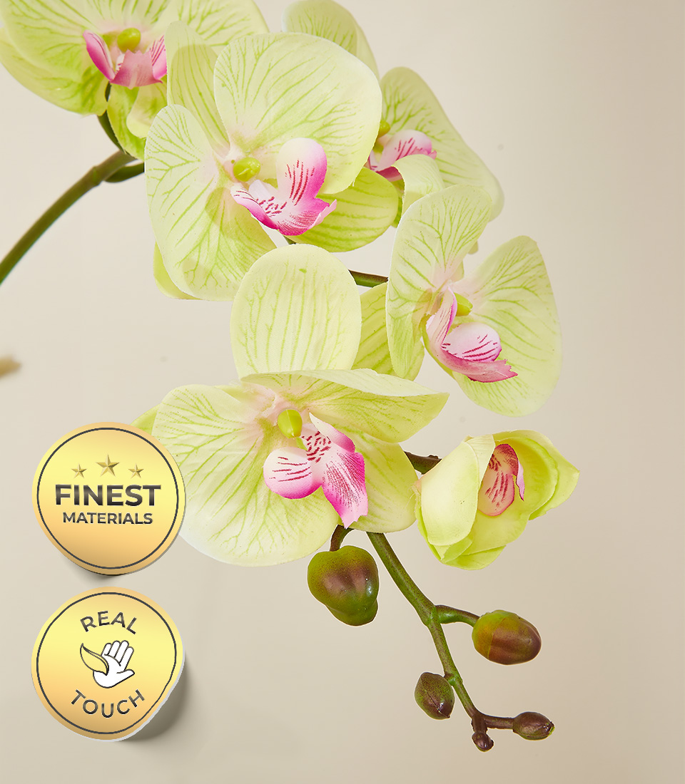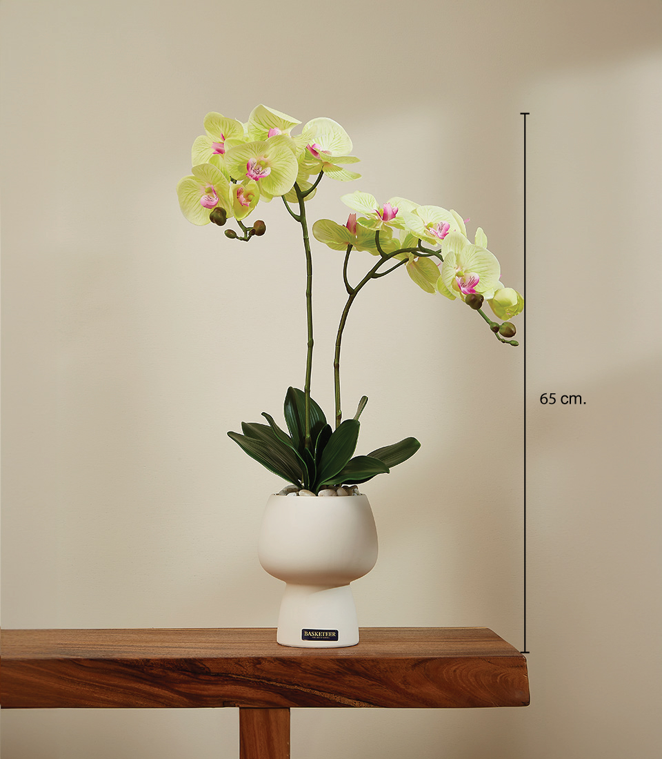 Lime Glow Potted Orchids lluminate your space with the refreshing beauty of our Lime Glow Orchid Arrangement. This exquisite features lifelike Phalaenopsis orchids with vibrant lime-green petals and delicate pink accents, elegantly arching over a sleek, modern white ceramic pot. The lush green leaves and realistic stems add a touch of natural charm, making this arrangement a stunning centerpiece for any room.