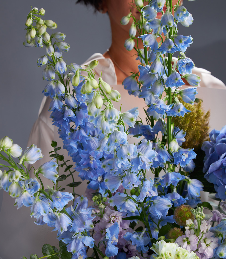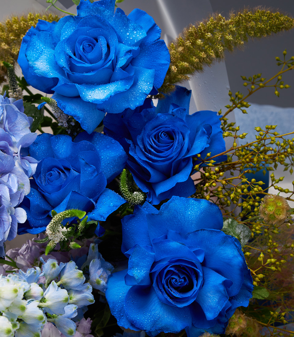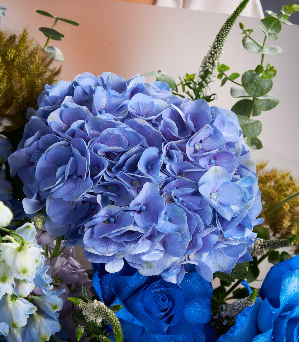 Stunning bouquet of blue roses hydrangeas and delphiniums beautifully arranged for premium flower delivery in Bangkok