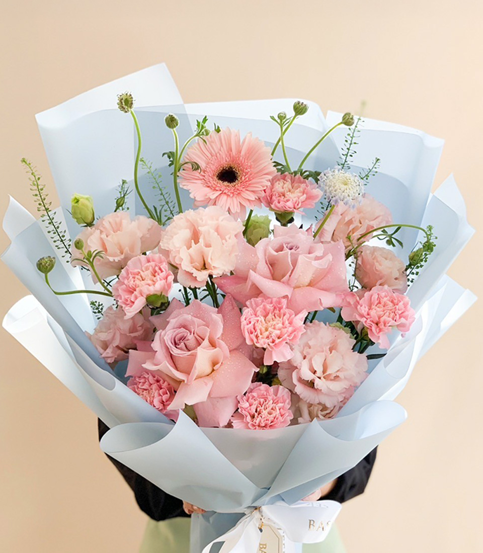 Delicate bouquet featuring pink roses, carnations, and gerberas wrapped in soft blue paper. A charming gift for birthdays, anniversaries.