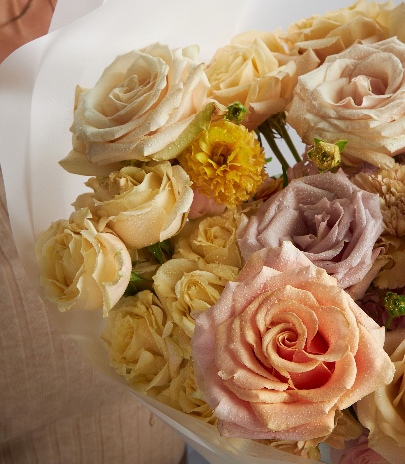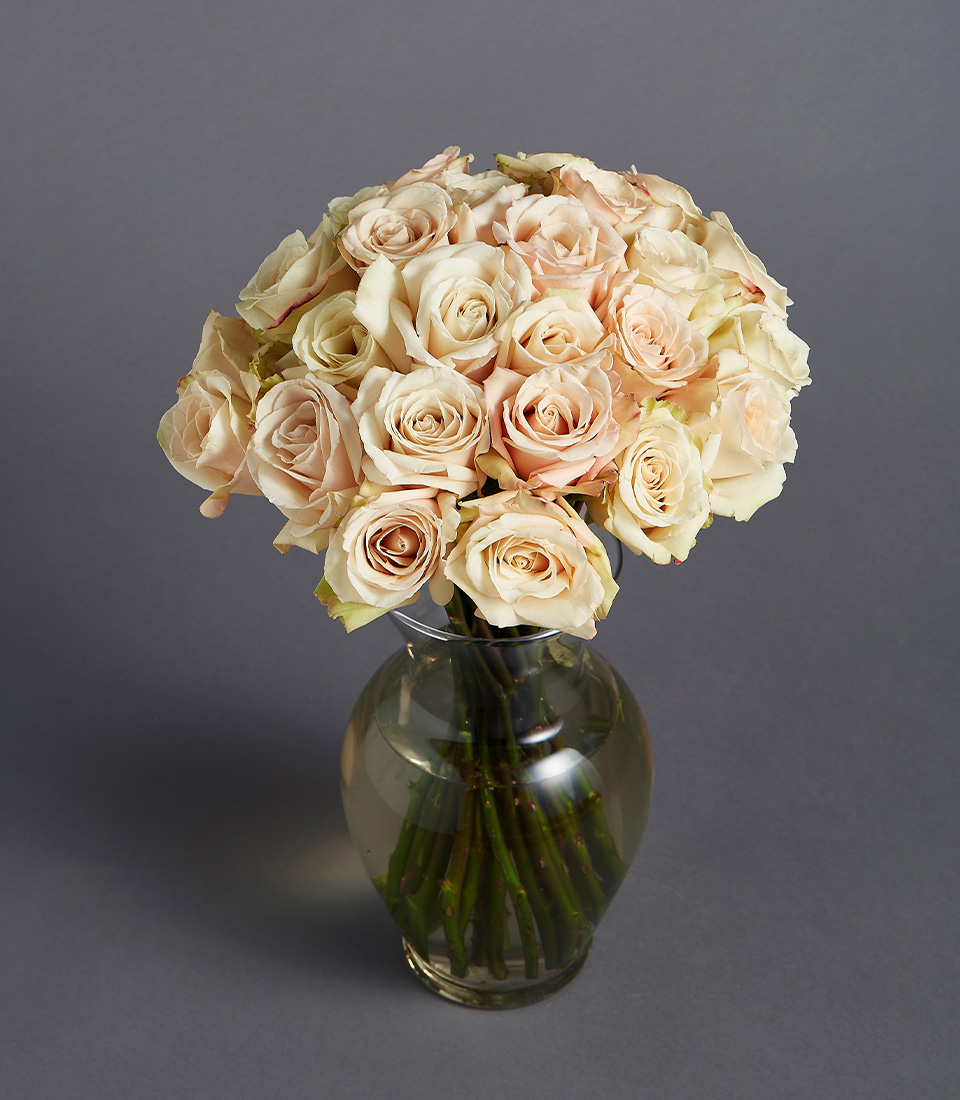 Blush Rose Bouquet Timeless Elegance A graceful bouquet of Quicksand, Phoenix, and Sahara roses with ranunculus and spray roses. Soft peach-beige tones make it perfect for any occasion.