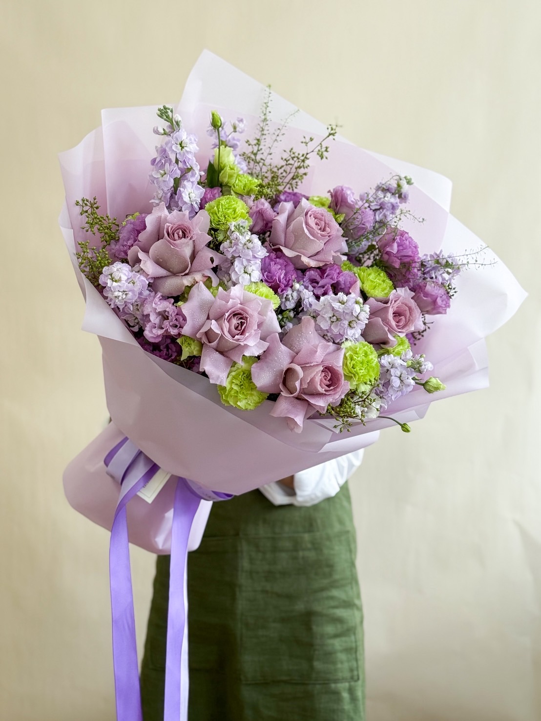Discover the Pastel Elegance Bouquet with purple roses and green blooms. Perfect for any occasion with same-day delivery in Bangkok.