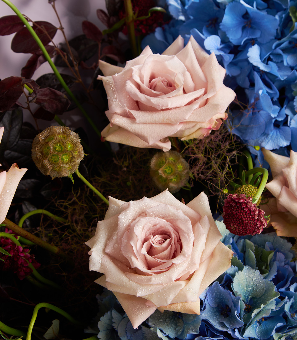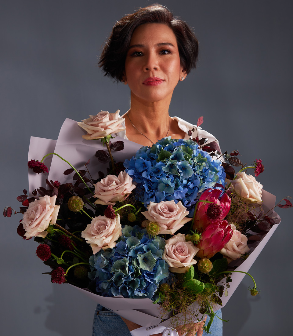 Elegant bouquet of nude roses blue hydrangeas and red protea beautifully arranged for premium flower delivery in Bangkok