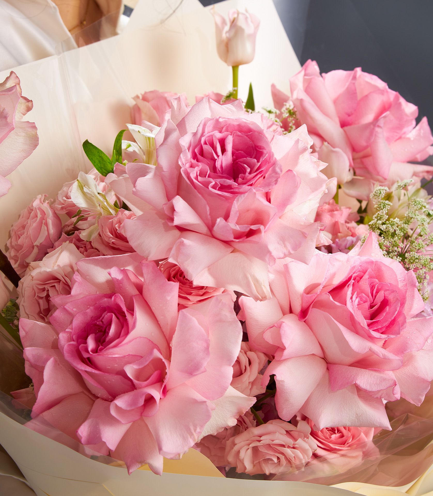 Elegant Pink Rose Bouquet A graceful bouquet of Mandala roses, pink tulips, and white Ammi Majus—crafted to express elegance, affection, and soft feminine charm.