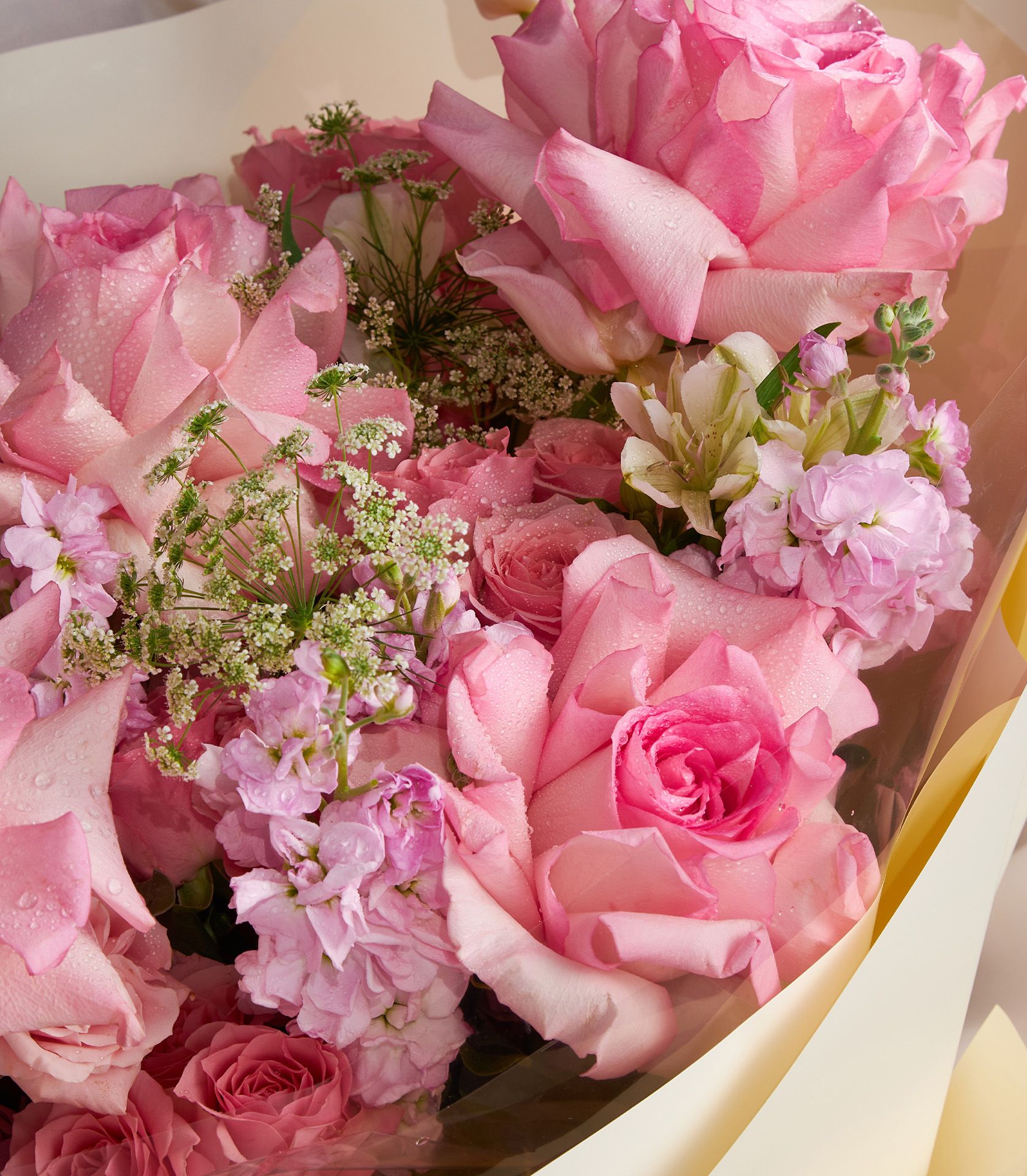 Luxurious bouquet of Mandala roses, pink tulips, spray roses, hydrangeas & stock, wrapped in elegant cream paper for timeless beauty.